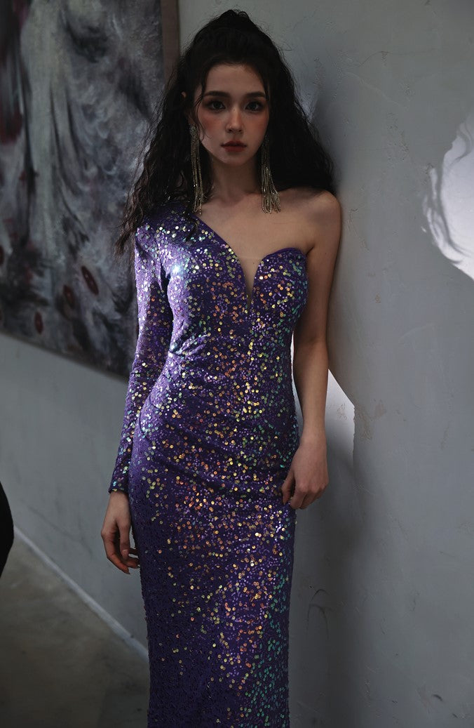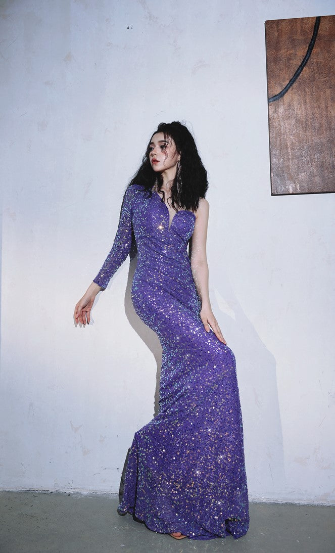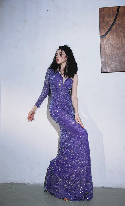 DOLLY Luxury Purple Sequin One Sleeve Off Shoulder Long Fish Tail Banquet Dress-AGNES