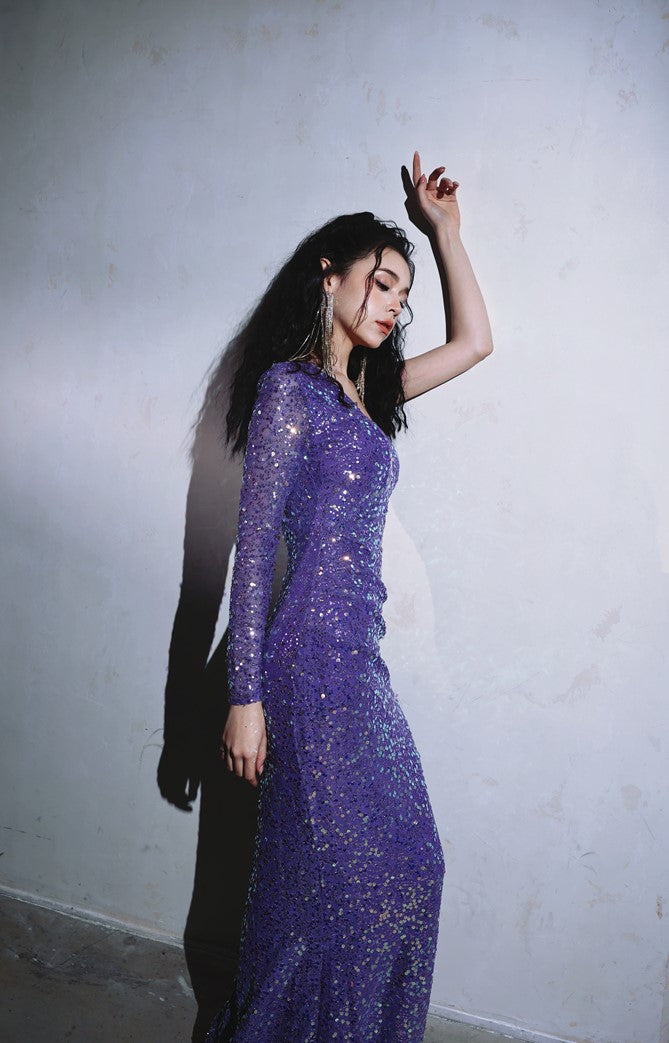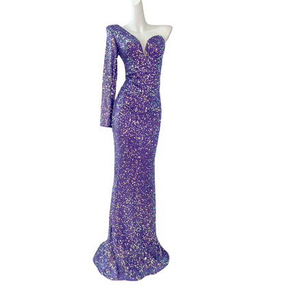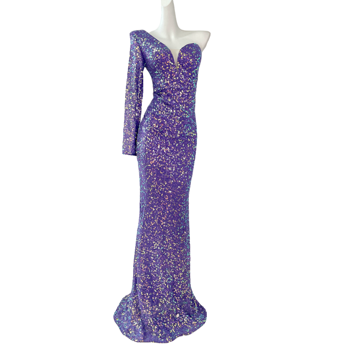 Indulge in luxury with our DOLLY Luxury Purple Sequin One Sleeve Off Shoulder Long Fish Tail Banquet Dress-AGNES. This glamourous dress features a stunning one sleeve design and opulent sequins for a truly captivating look. Perfect for any special occasion, this dress exudes elegance and sophistication, making you the star of the event. (v)