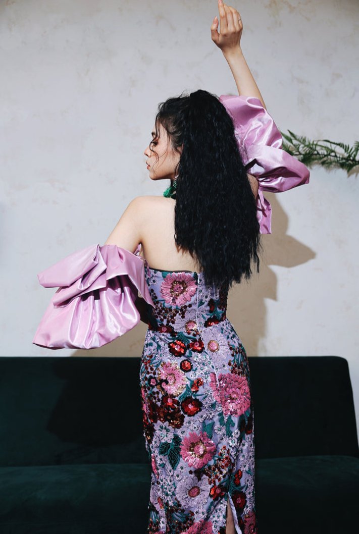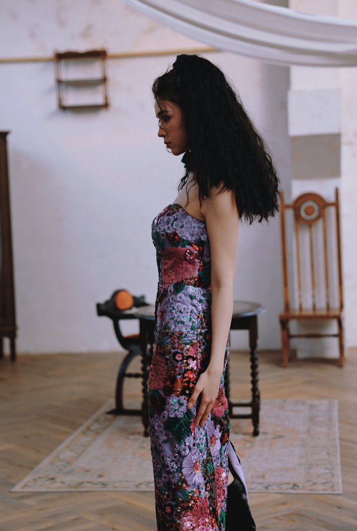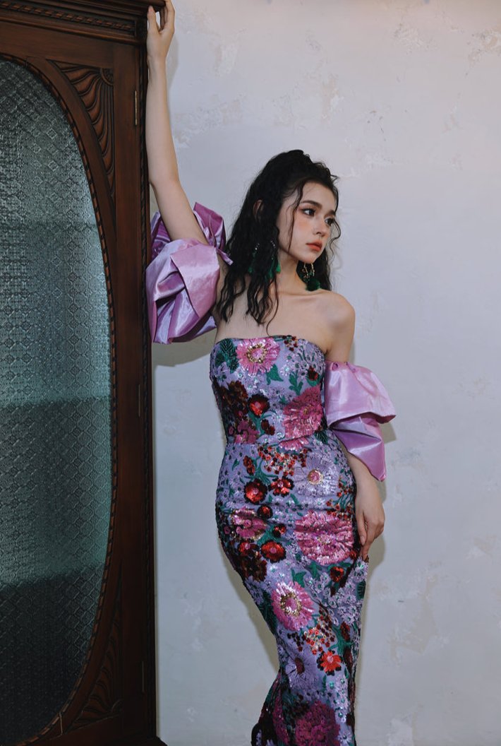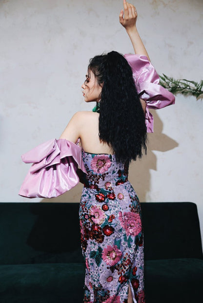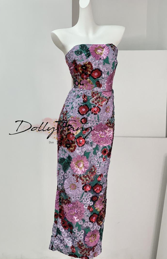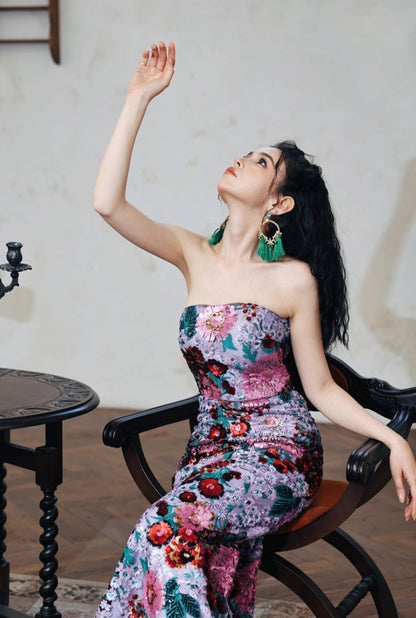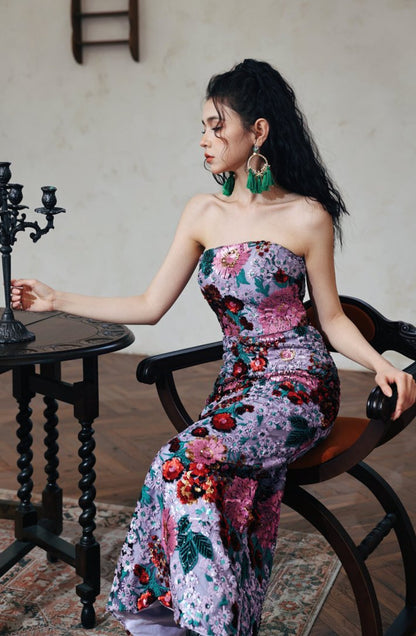 DOLLY Luxury Retro Purple Floral Embroidered Tube Top Long Sequin Party Dress-JOY