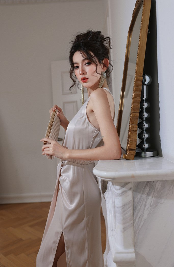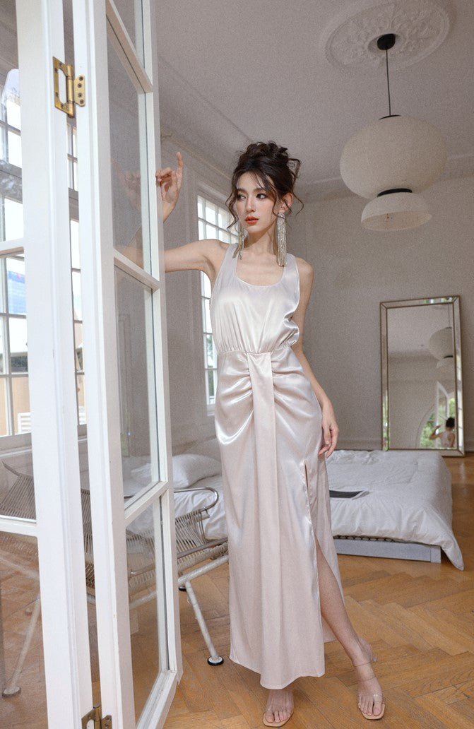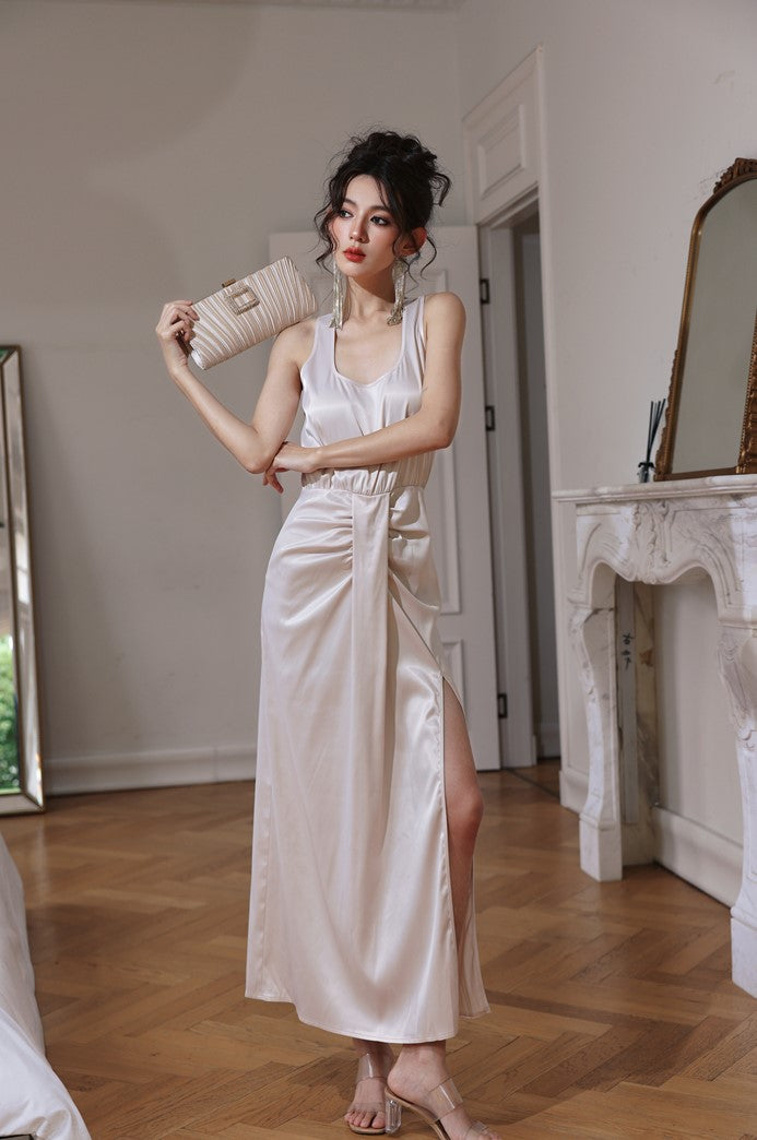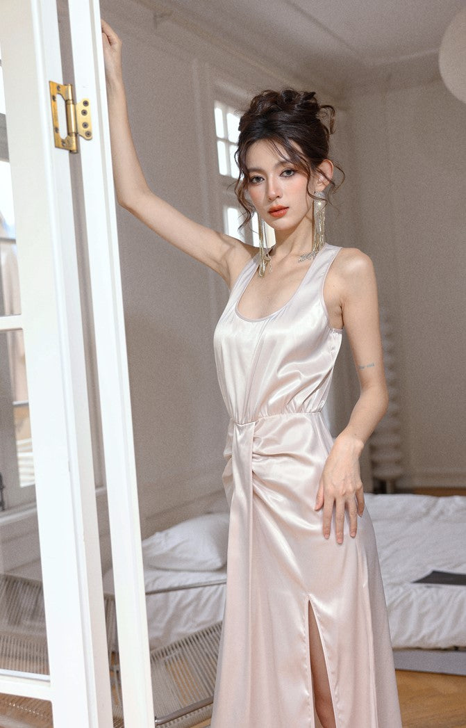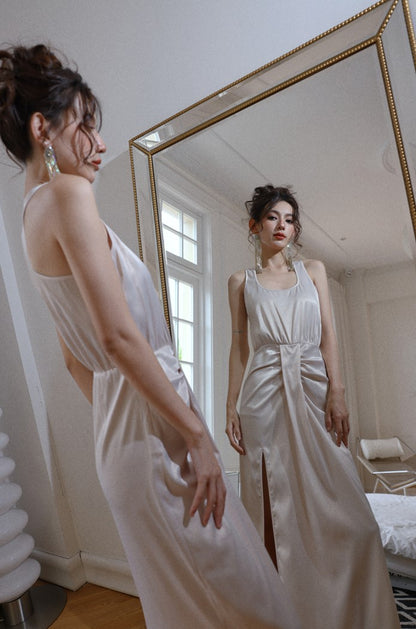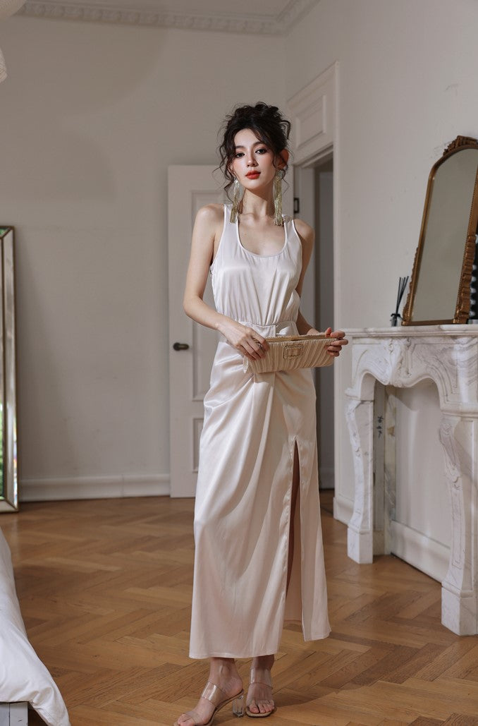 DOLLY Luxury Silky French Style Sleeveless Pleated Backless Dinner Dress-MERRY
