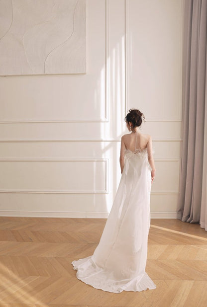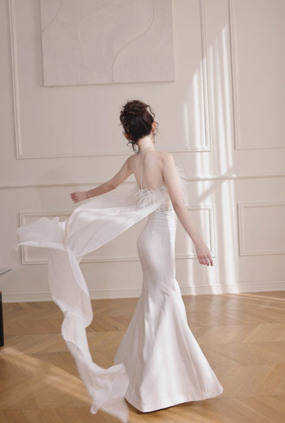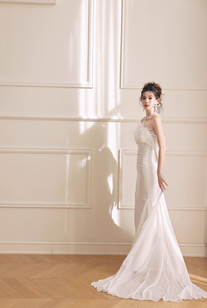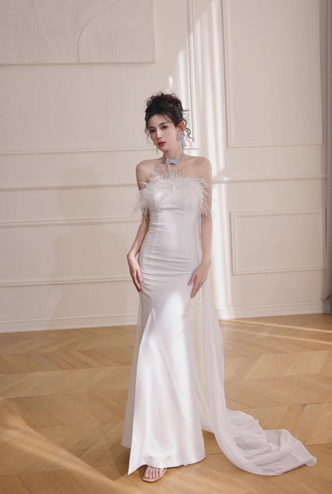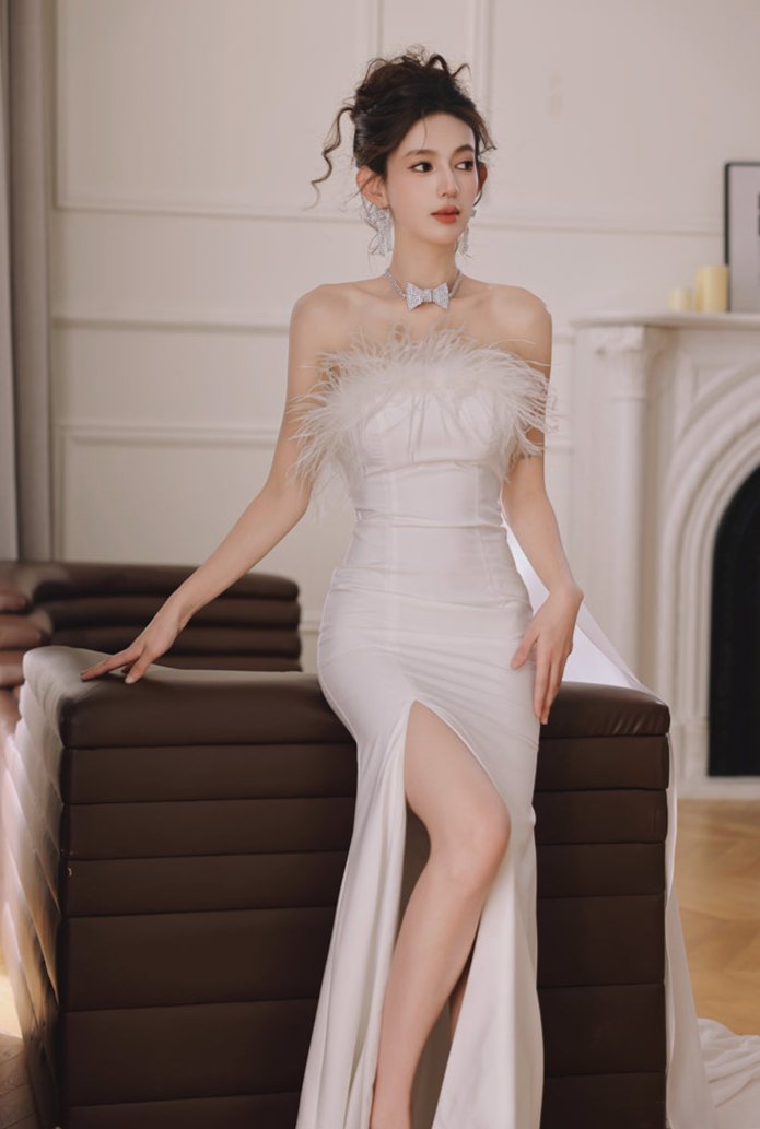 DOLLY Luxury White Feather Tube Top Slim Fit Long Slit Banquet Dress-LEMON