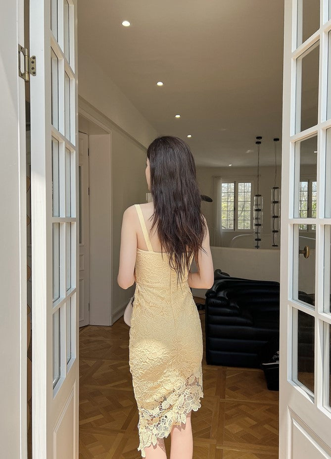 DOLLY Luxury Yellow V-Neck Sleeveless Slim Fit Lace Suspender Dress-TANYA