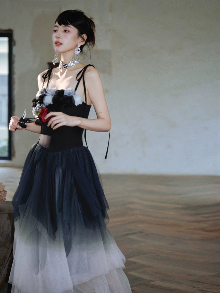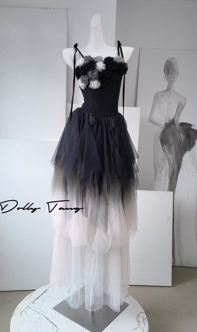 Indulge in luxury with our DOLLY Elegant Black Gradient French Style Suspender Irregular Prom Dress-Marcia. Exquisitely crafted with a stunning black gradient design, this dress exudes elegance and sophistication. Perfect for any special occasion, you will feel like a true style icon in this one-of-a-kind piece. Elevate your wardrobe and make a statement with this luxurious dress.