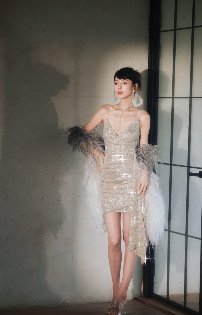 DOLLY Elegant Deep V-Neck Sleeveless Glitter Sequin Short Cocktail Dress-Sasa (V)
