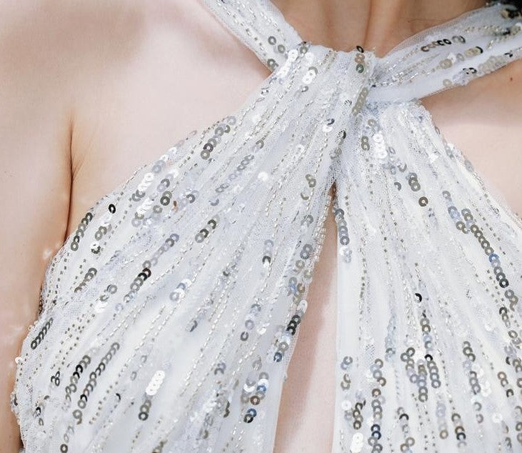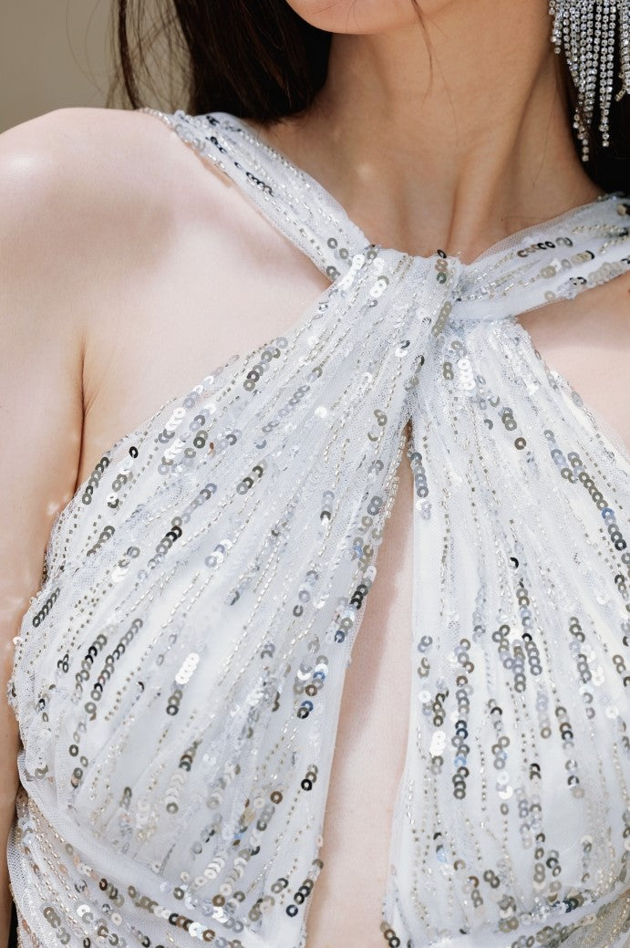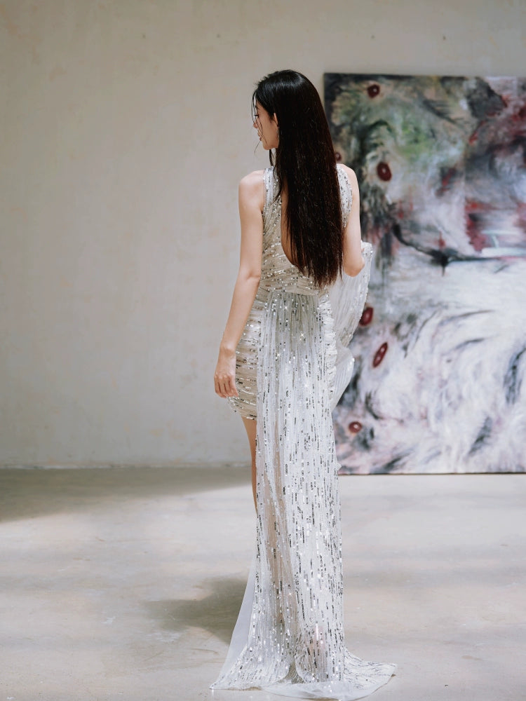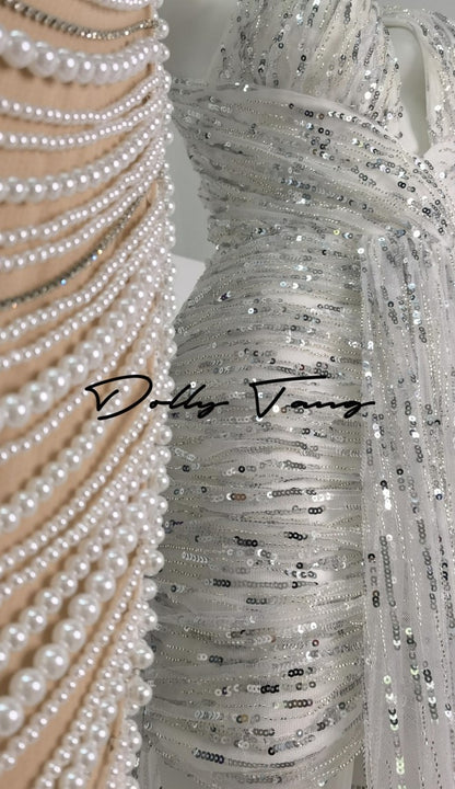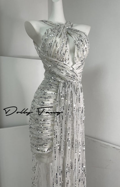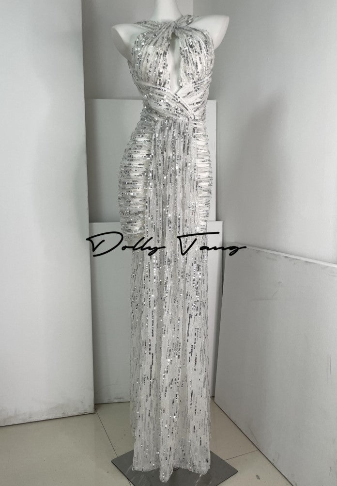DOLLY High End White Glitter Deep V-Neck High Waist Long Party Dress-Xen