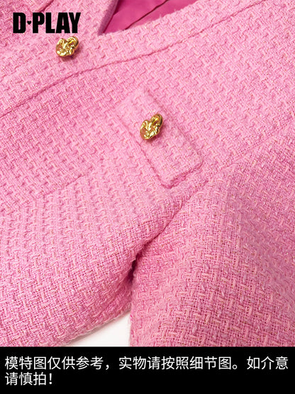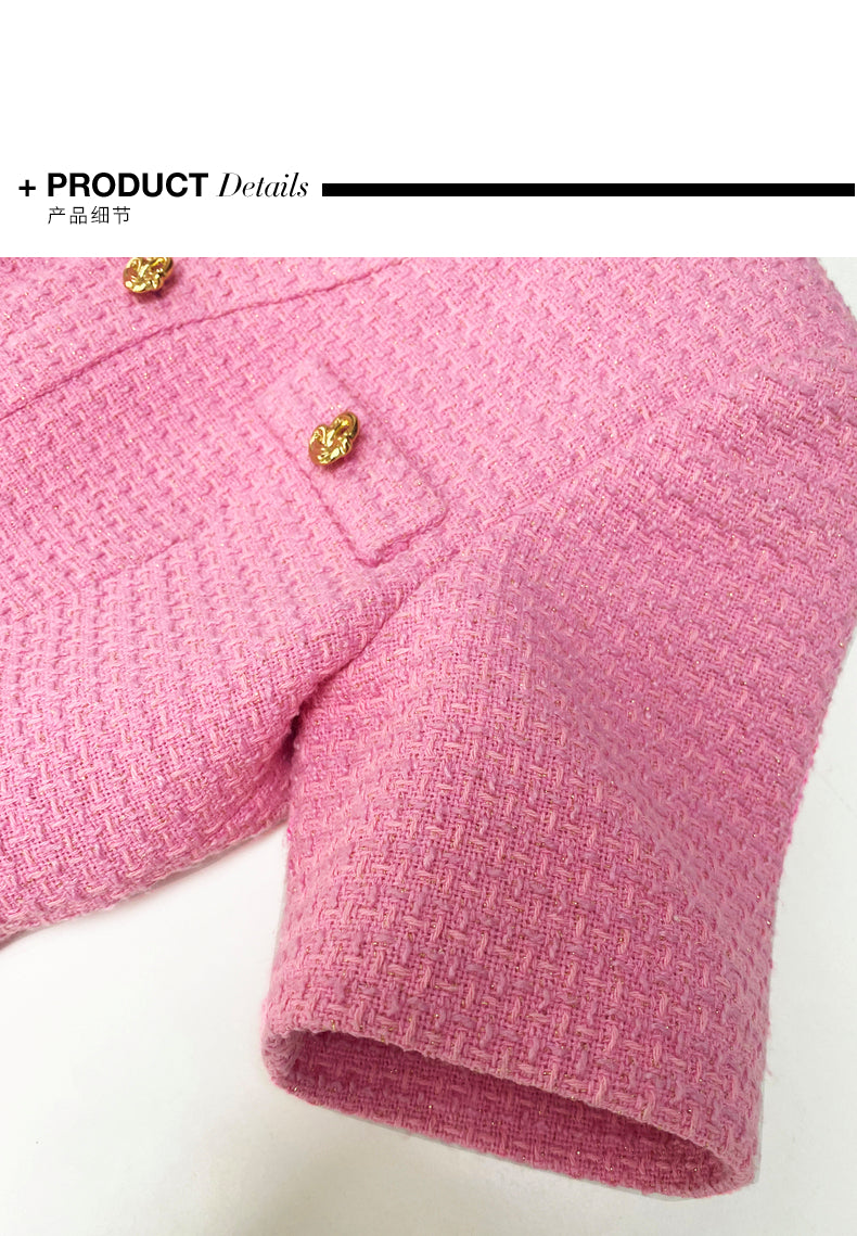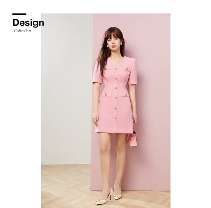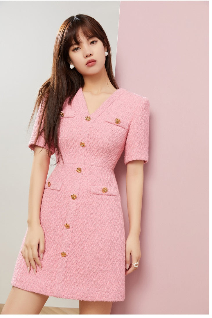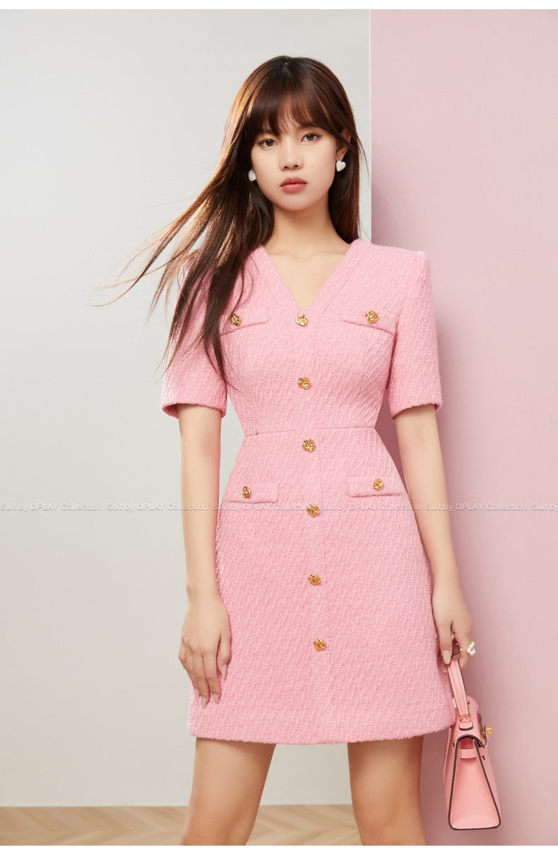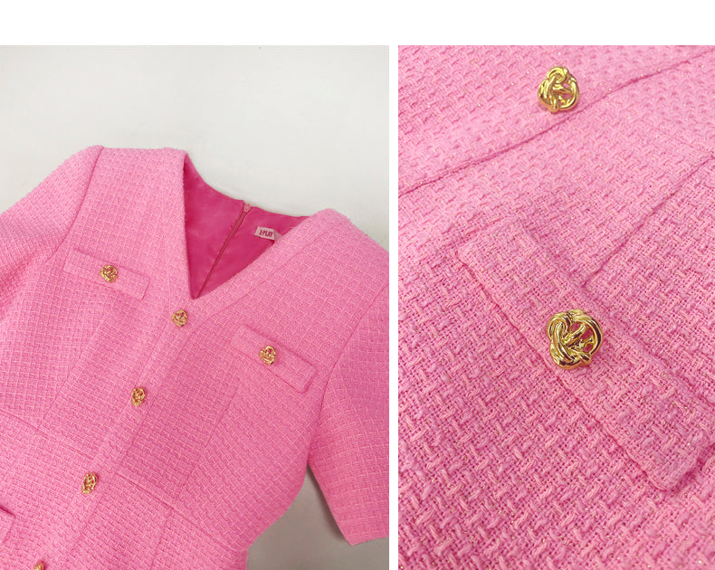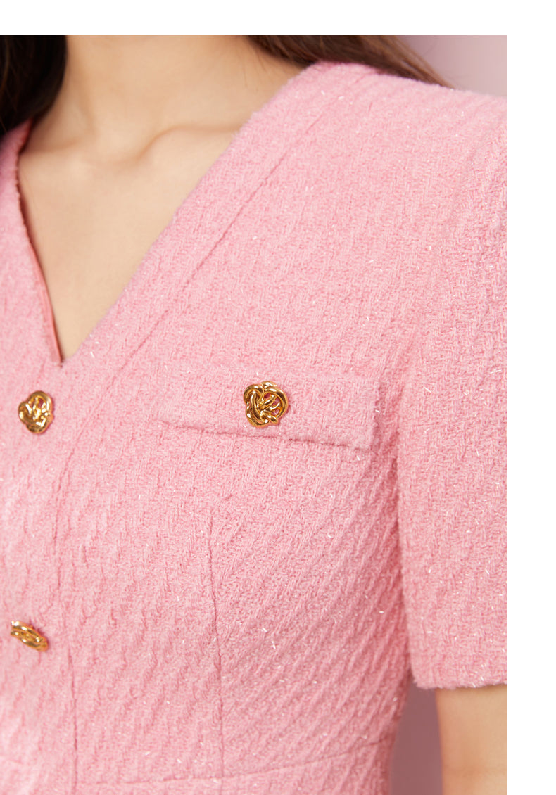 Bubble gum powder pink V-Neck short sleeve Tweed cocktail dress- Sara
