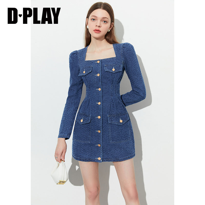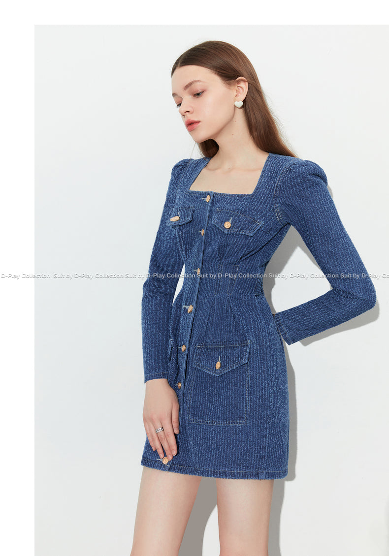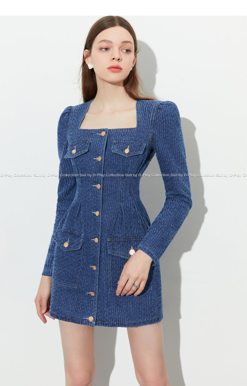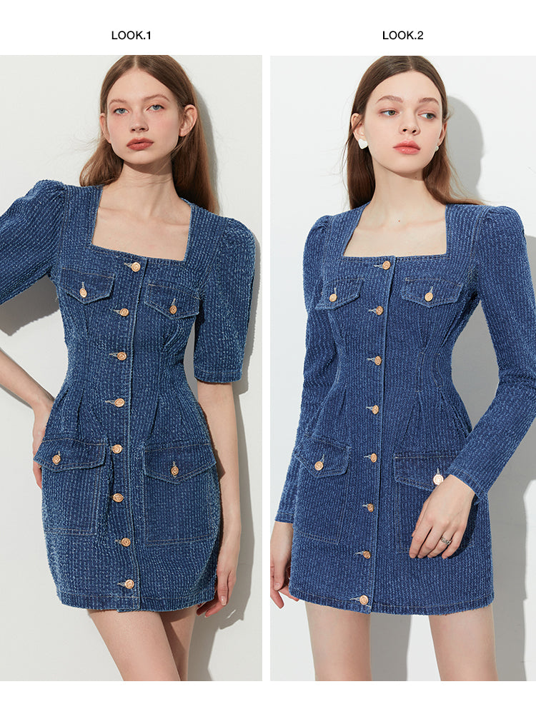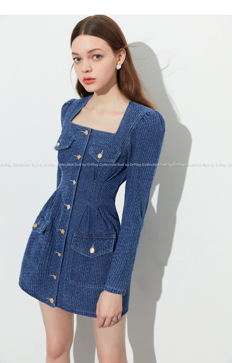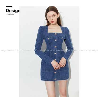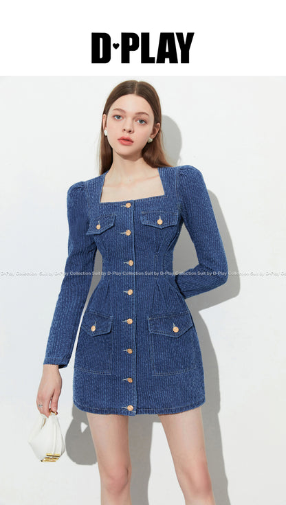 DPLAY fall Autumn Vintage French Square Neck Puff Sleeve Denim dress - Kaidi