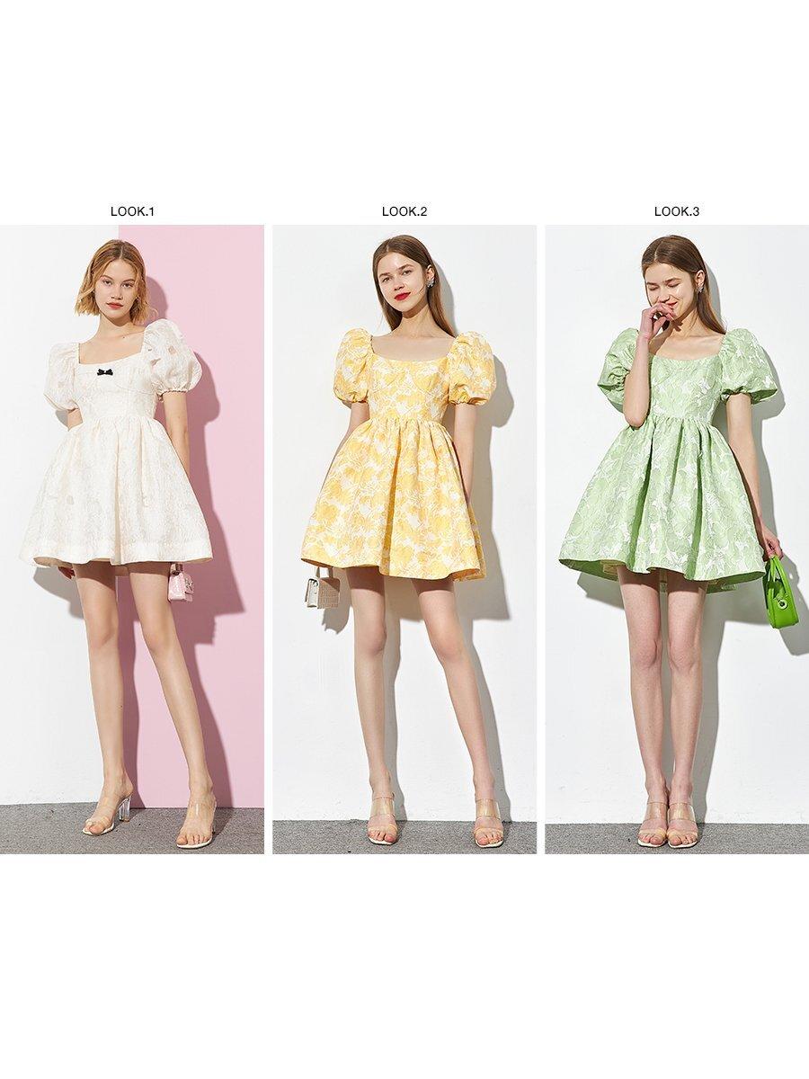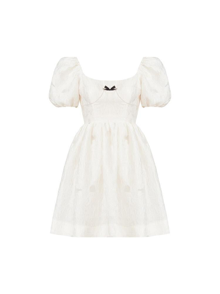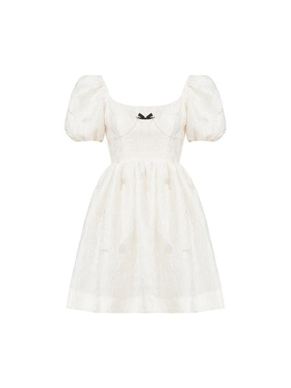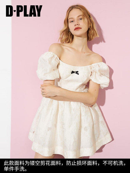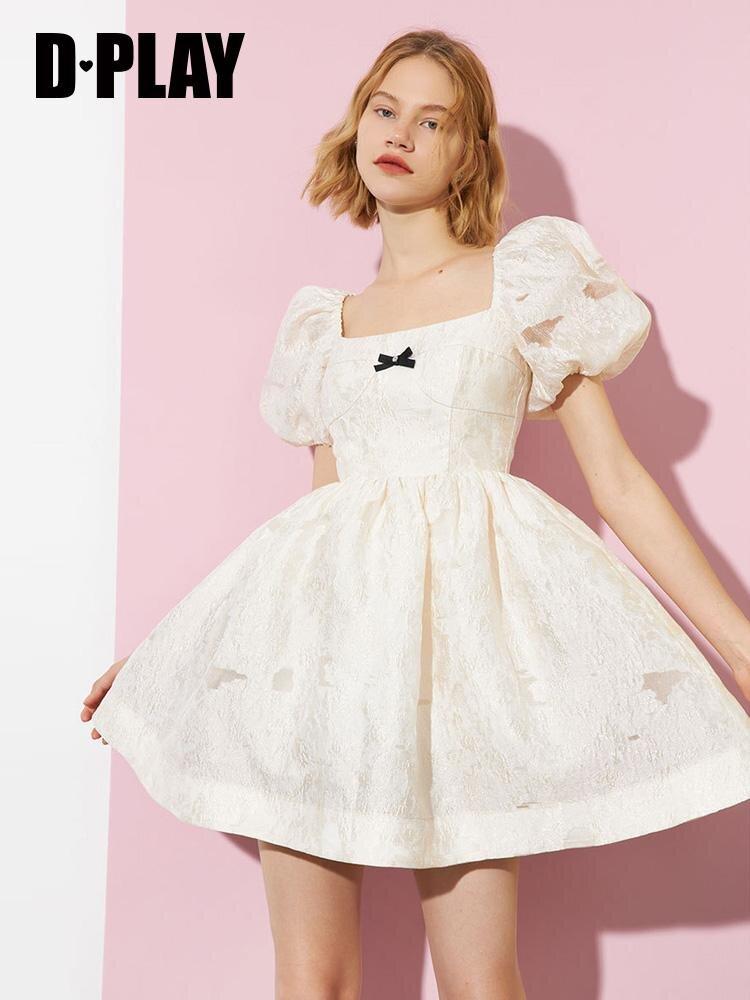 DPLAY Summer New Almond Milk White Princess Tutu Small Puff Sleeve Dress - Tria Heavy Industry Embossed Dyeing Jacquard Fabric Retro Puff Sleeve