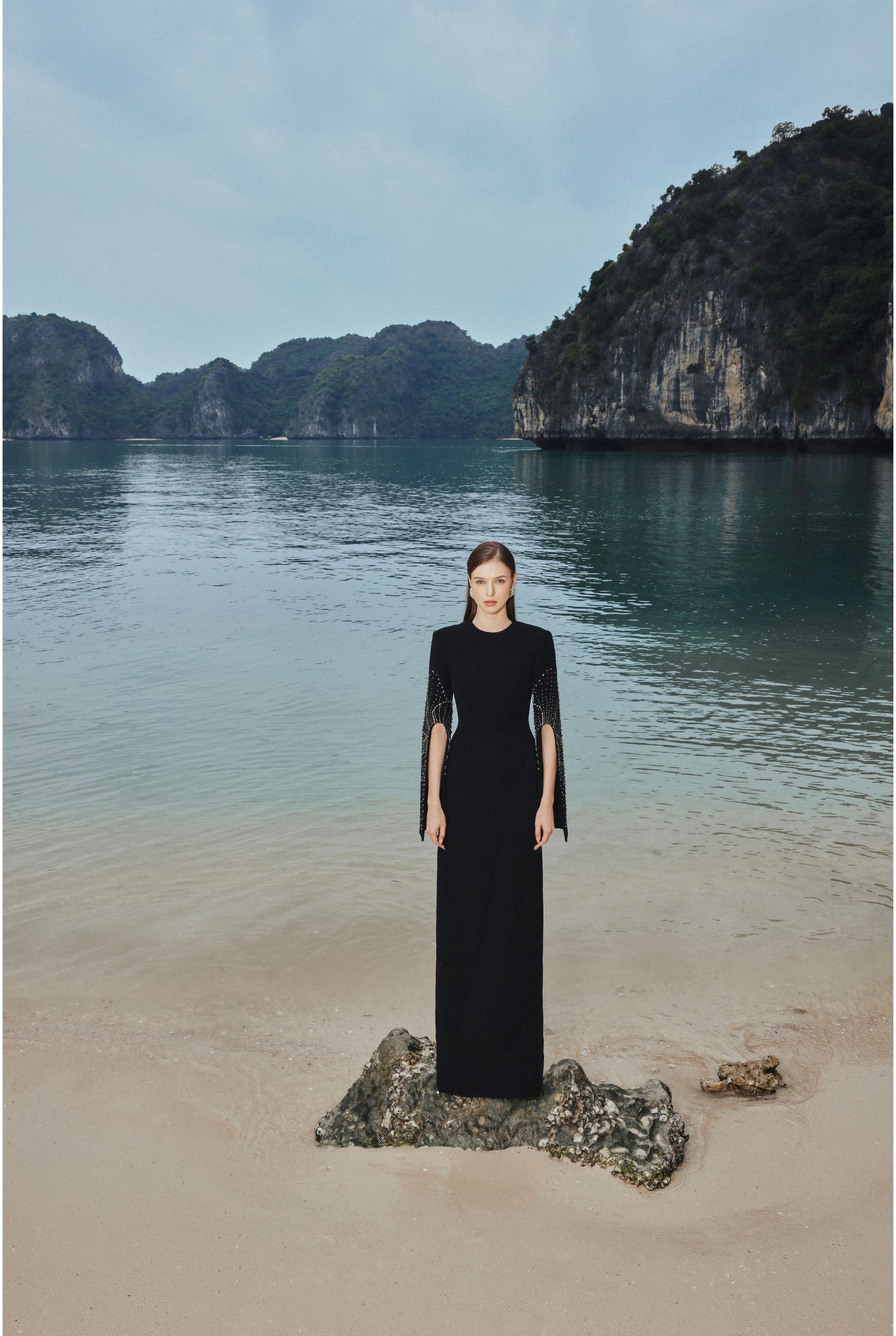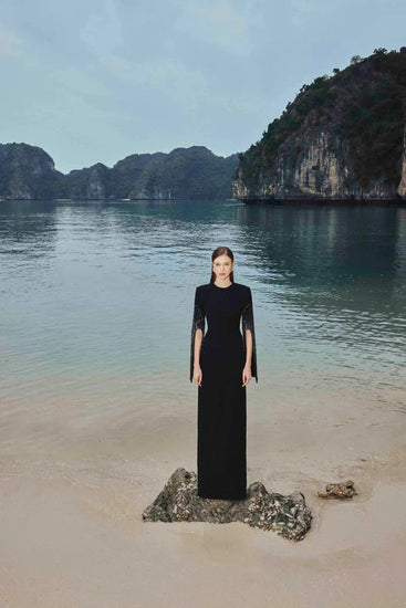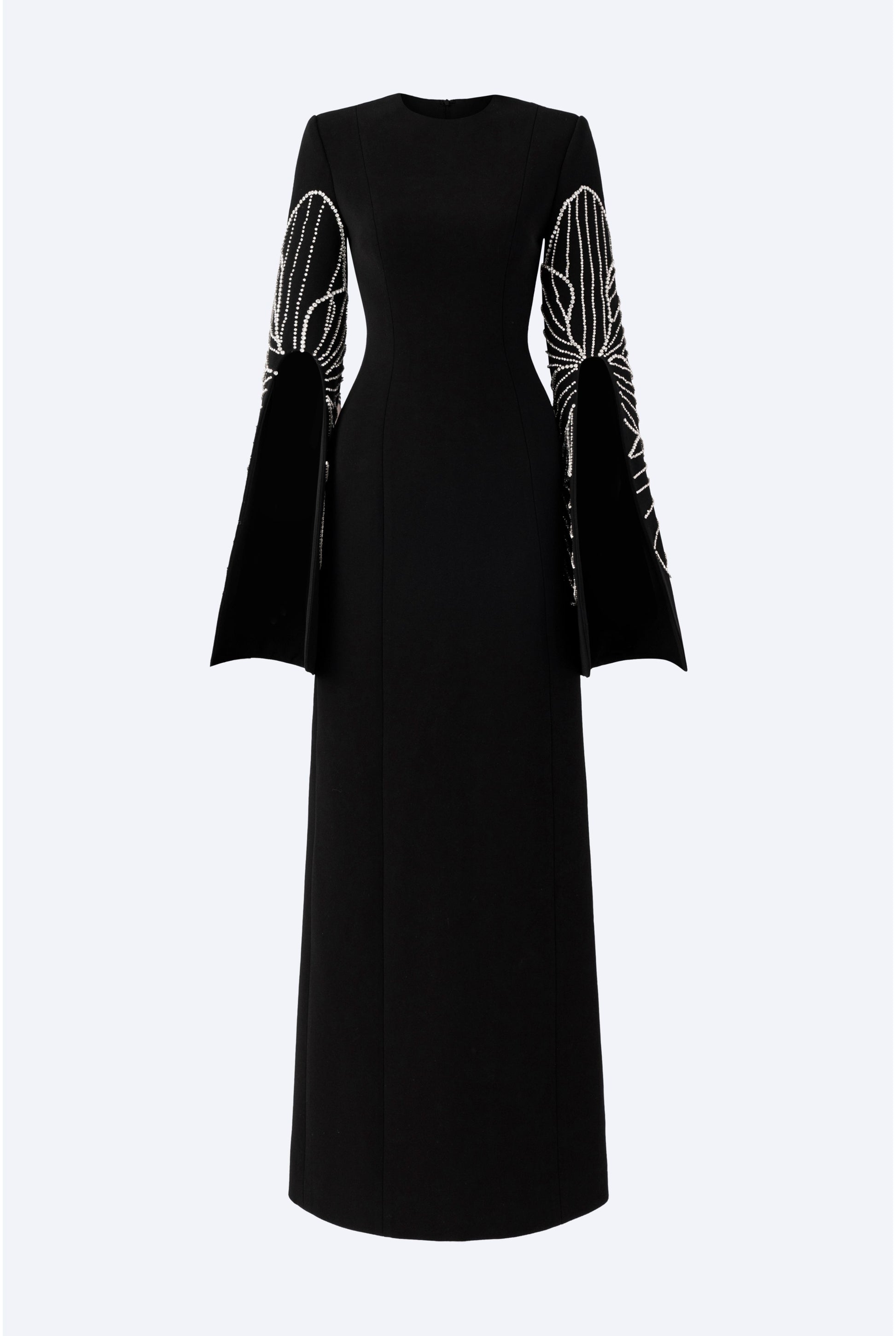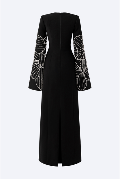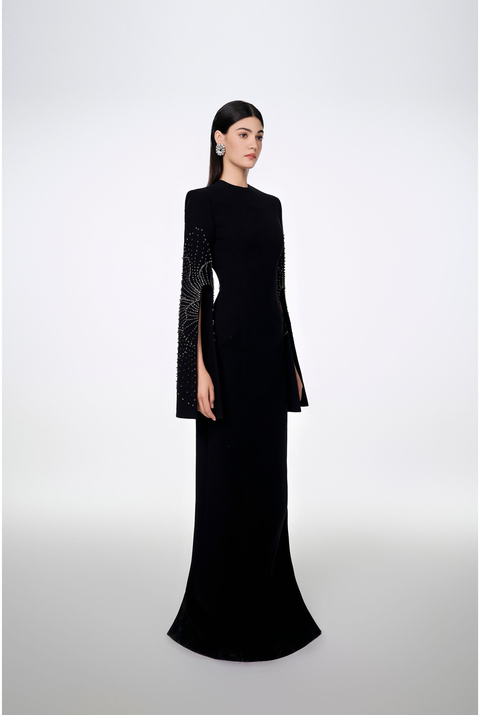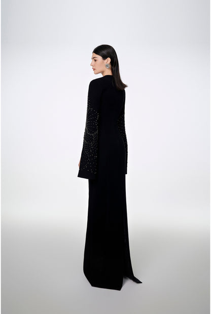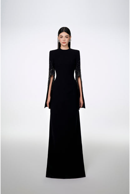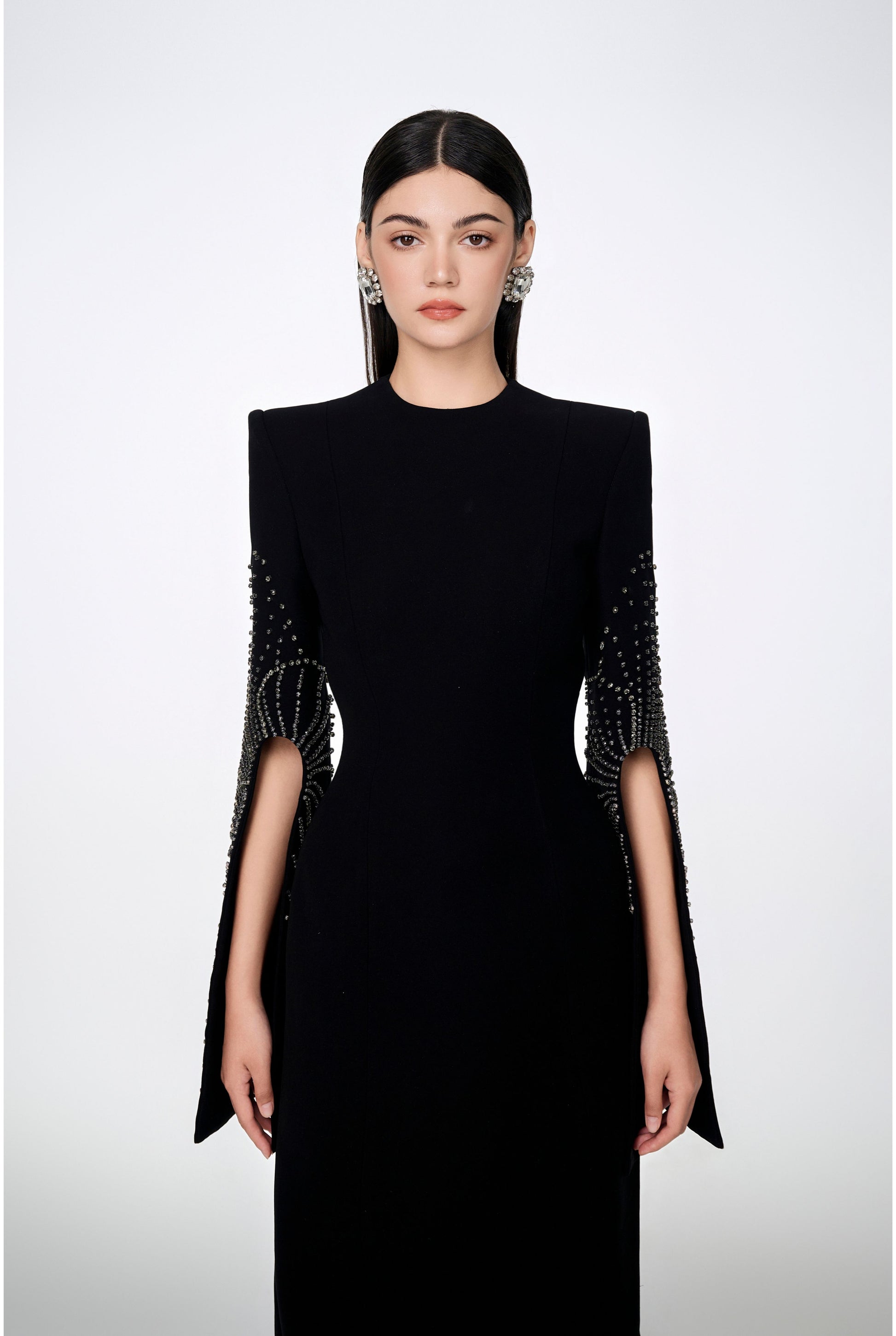 Loyal to its commitment to modern, dynamic and chic fashion, Tracy Studio presents a stunning bodycon dress with stone embellishment on sleeves which are slit for wearers' convenience. The dress is a blend of advanced tailoring techniques and meticulous attention to detail. Perfect for parties and special events, this dress is sure to turn heads and make a bold fashion statement.