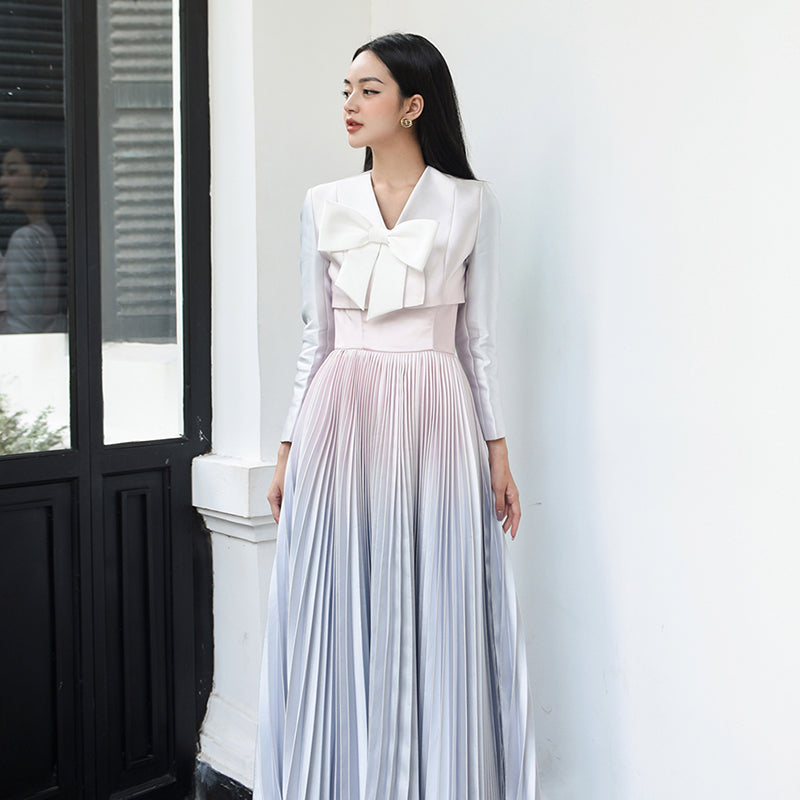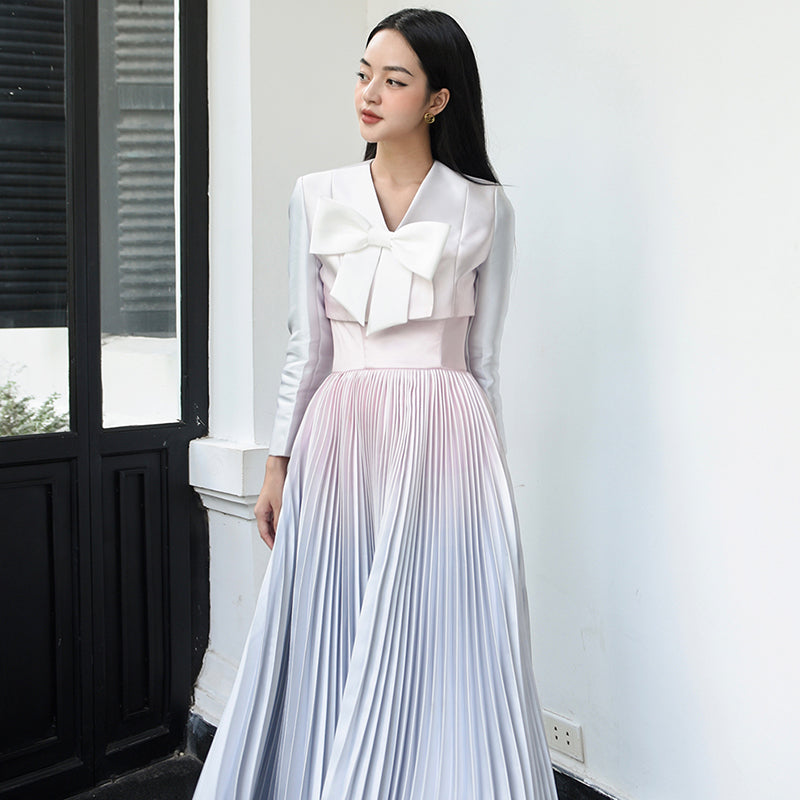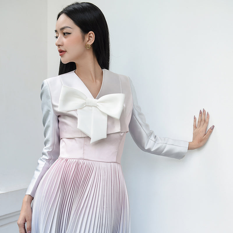 Celia Regina's midi dress features a V-neck, long sleeves, bowtie, and a pleated A-line skirt with a total length of 125cm. Crafted from taffeta, the ensemble includes a gradient long-sleeved jacket and a tube top dress.