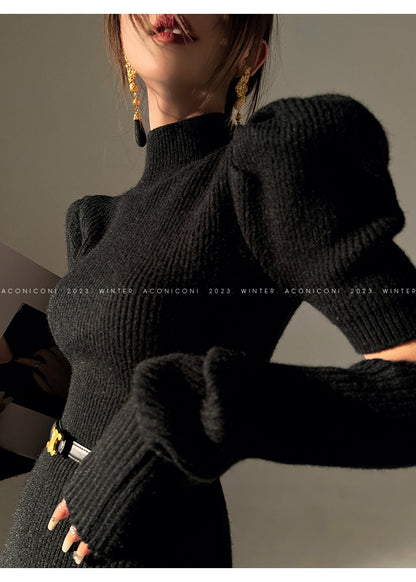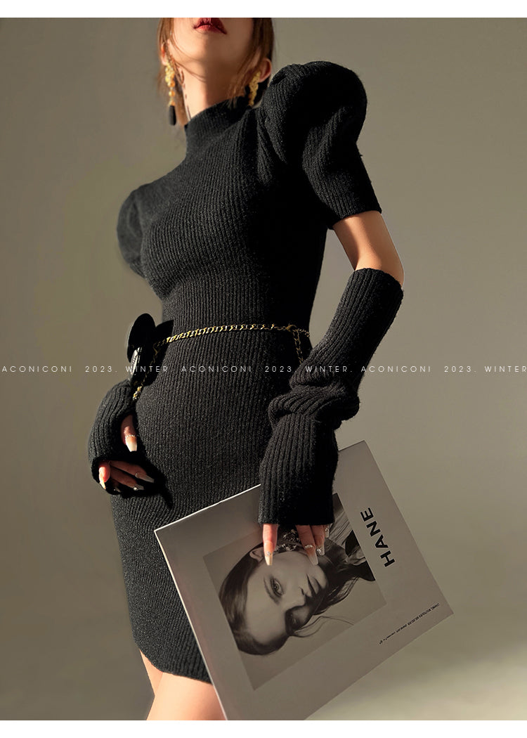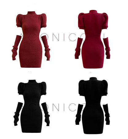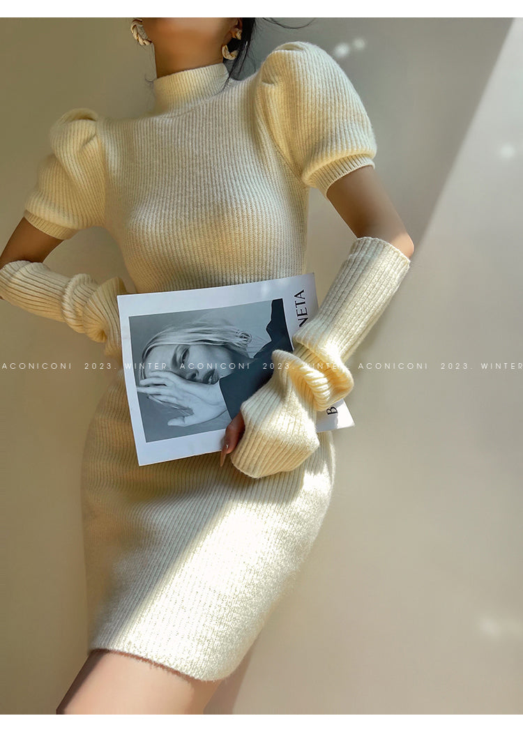 Cream milk red knitted puff sleeve sweater dress- Mousse Milk Puff