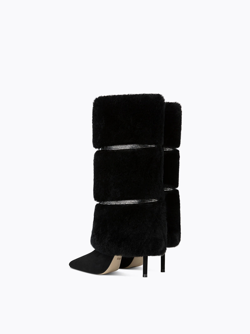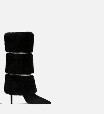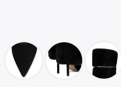Fabfei Fall/Winter pointed toe black high heel sexy stiletto mid-length boots fur boot - Marai
