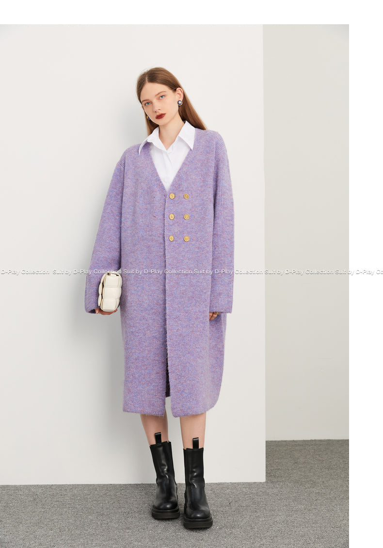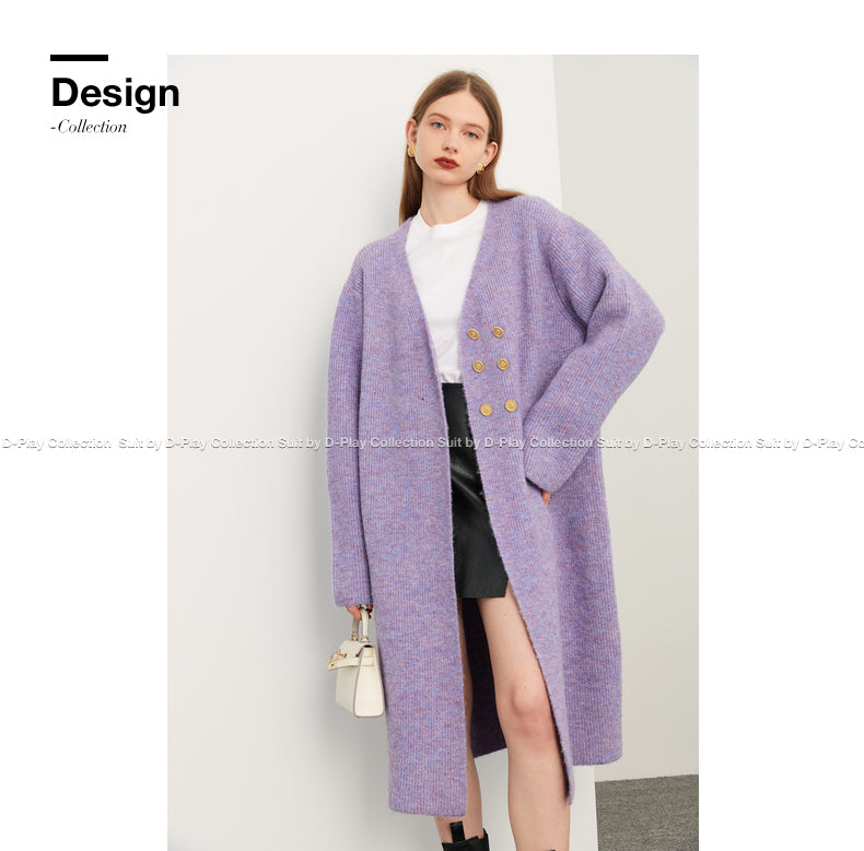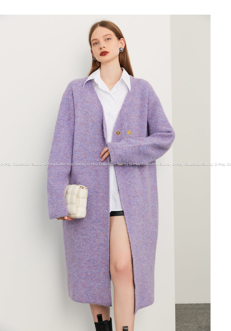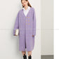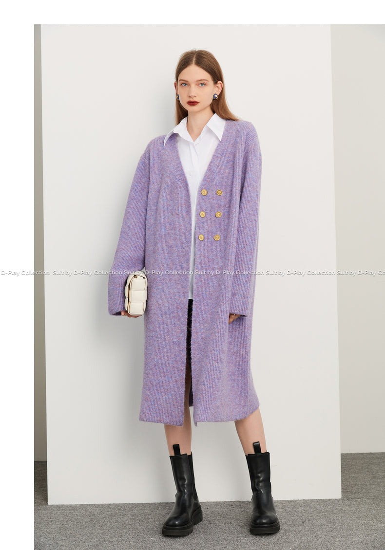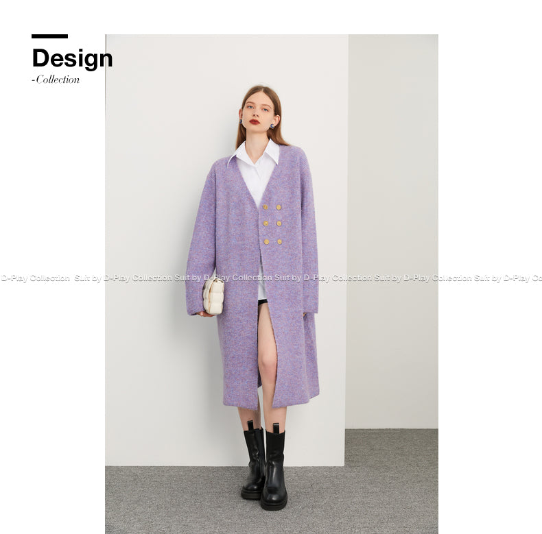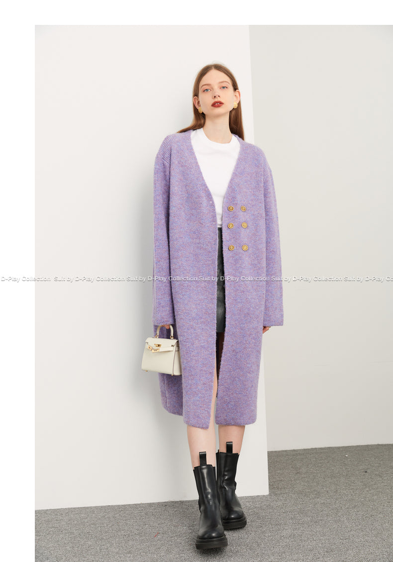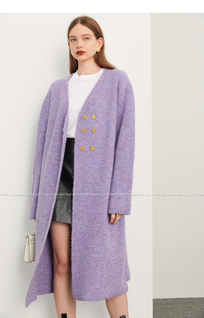 Fall autumn lavender purple double-breasted loose-embossed camellia knit coat - Saie