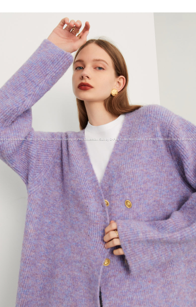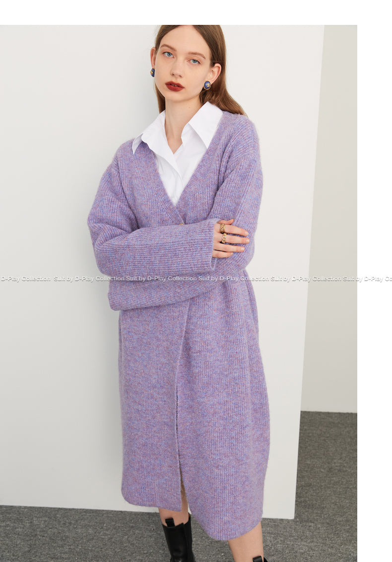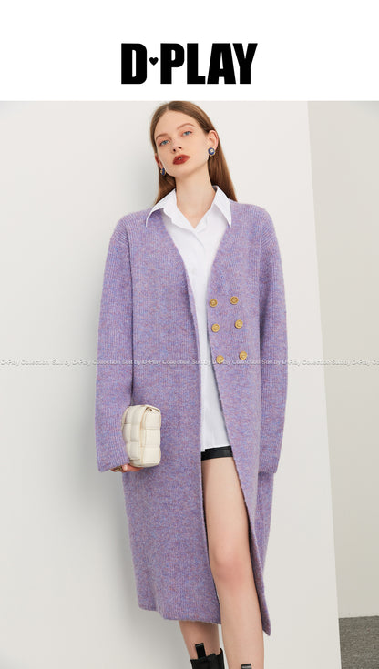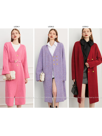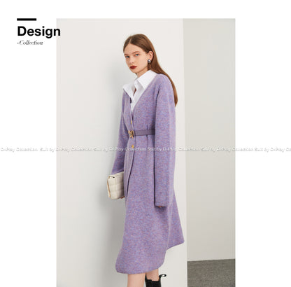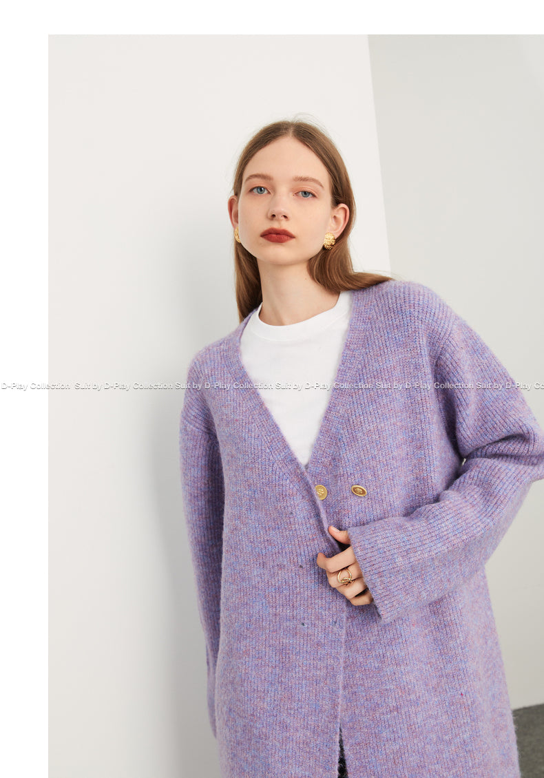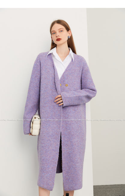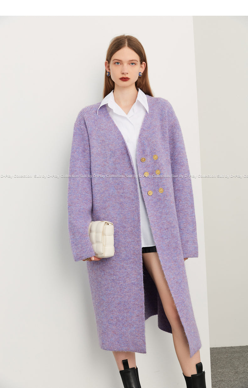 Fall autumn lavender purple double-breasted loose-embossed camellia knit coat - Saie