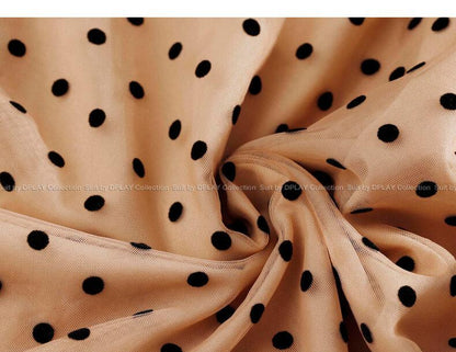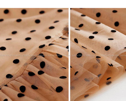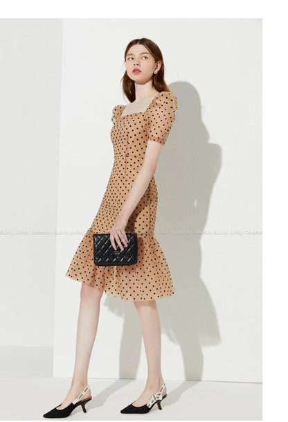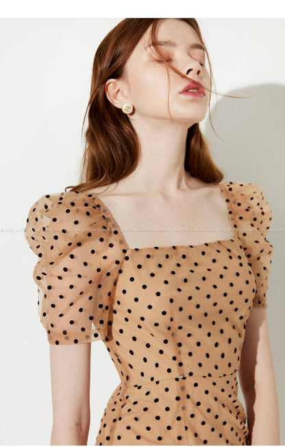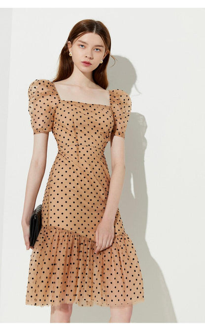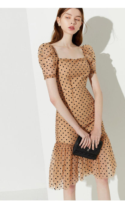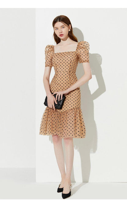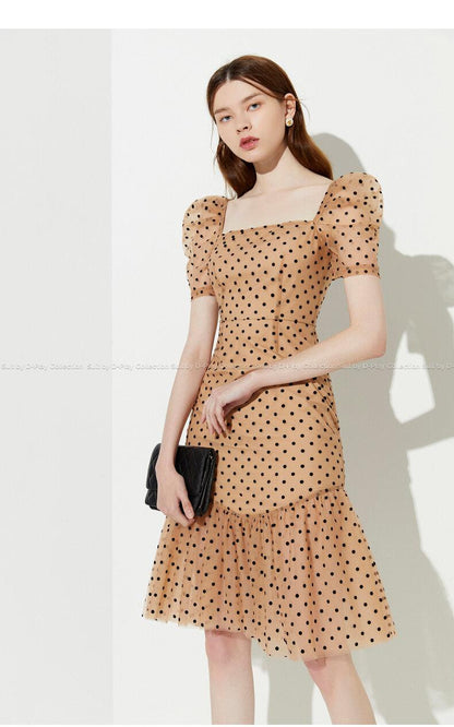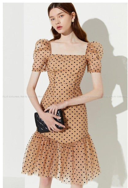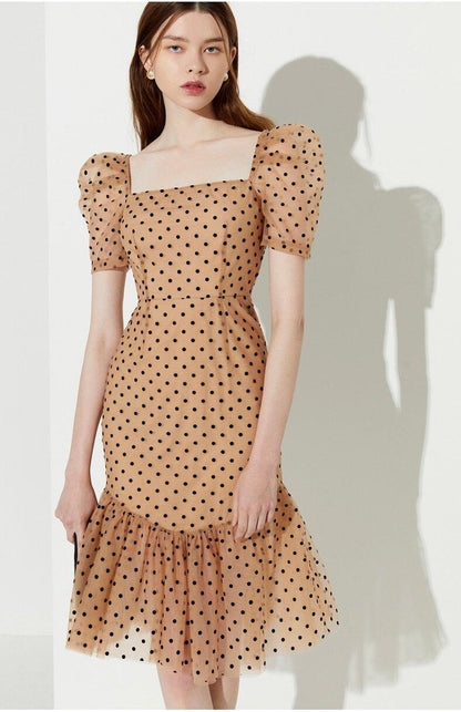 New wave polka dot puff sleeve French square neck fishtail dress - Carly
