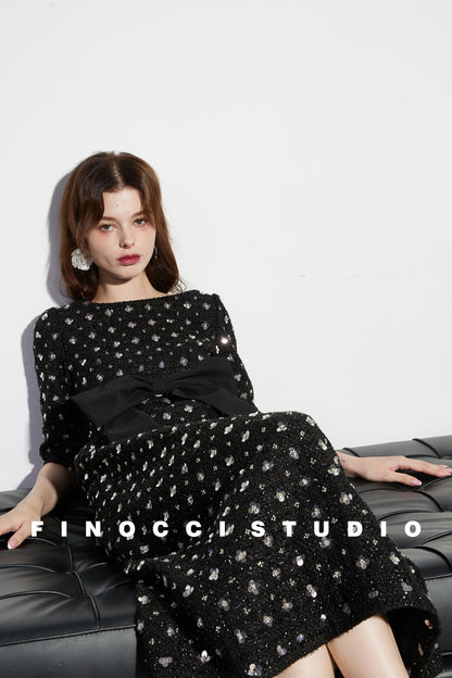 Heavy embroidered flowers vintage waist shiny silk tweed black dress - Carilow