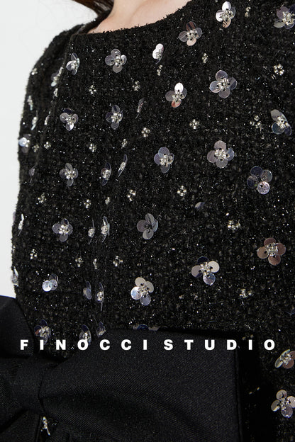 Exquisite and timeless, the Carilow black dress is made of luxurious silk tweed and embellished with heavily embroidered flowers. A classic and unique piece, it will add an air of elegance to any outfit.