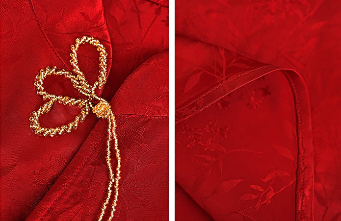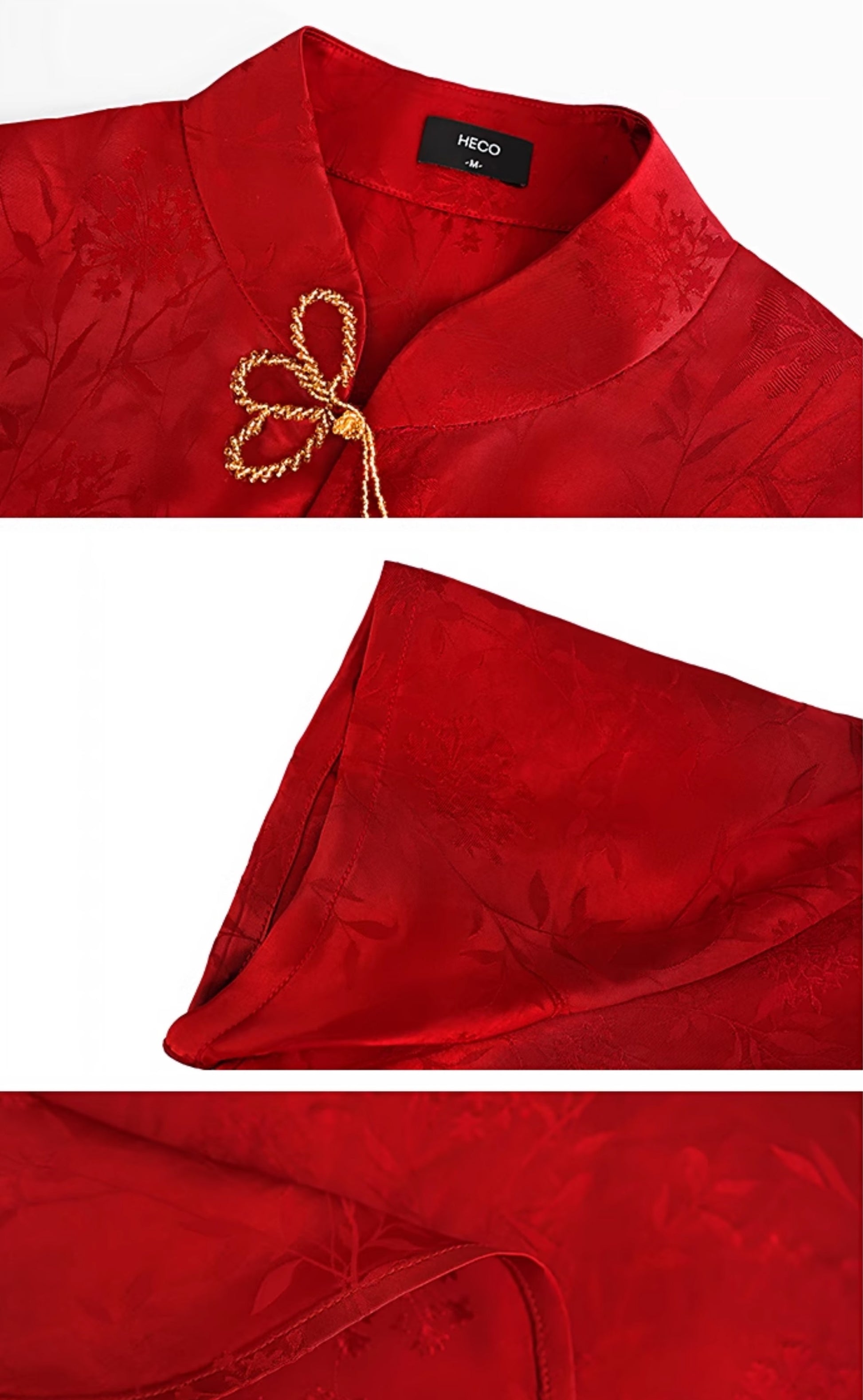 Experience refined craftsmanship with the HECO Chinese Handmade Beaded Embroidery Buckle T-Shirt. Featuring elegant jacquard fabric and a mandarin collar, its short sleeves ensure comfort and style. Intricately hand-beaded embellishments add a distinctive artistic touch, while the rich palette of red, black, and apricot offers versatile sophistication. This piece blends traditional techniques with contemporary design for a unique wardrobe staple.