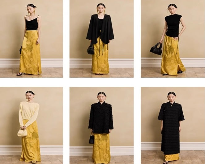 Complete your elegant look with the HECO Acetate Peony Jacquard Embroidery Skirt. This chic skirt features a high waist design and comes in both black and yellow colors. Perfect for any formal event, this maxi skirt will elevate your style.