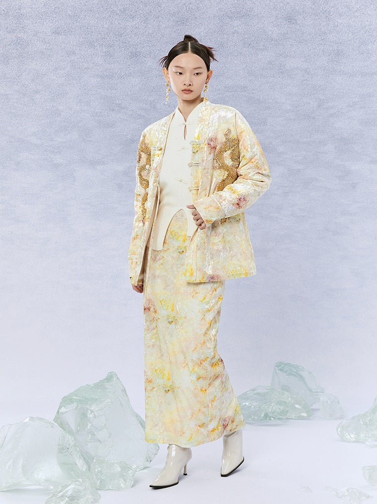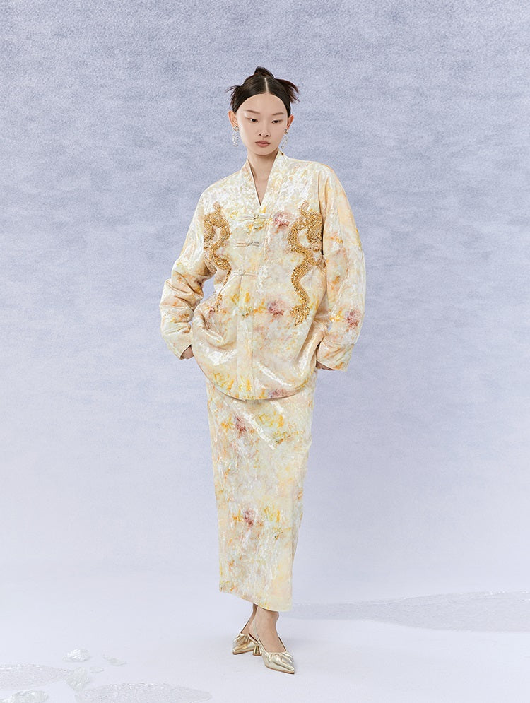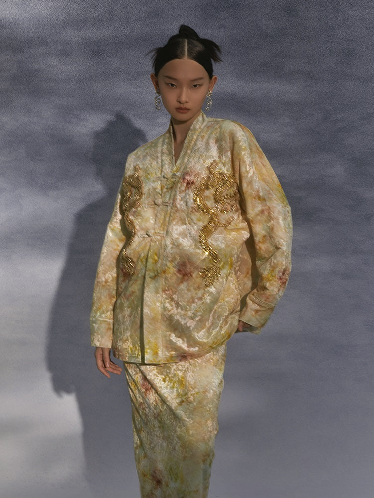 This loose-fitting jacket is crafted from 100% polyester, offering lightweight comfort ideal for spring and summer. Featuring a single-breasted design and long sleeves, it showcases a unique grass and wood-inspired beige tie-dye pattern that adds subtle artistic flair. Perfect for layering, this jacket combines breathable fabric with a relaxed silhouette for effortless style and versatility.