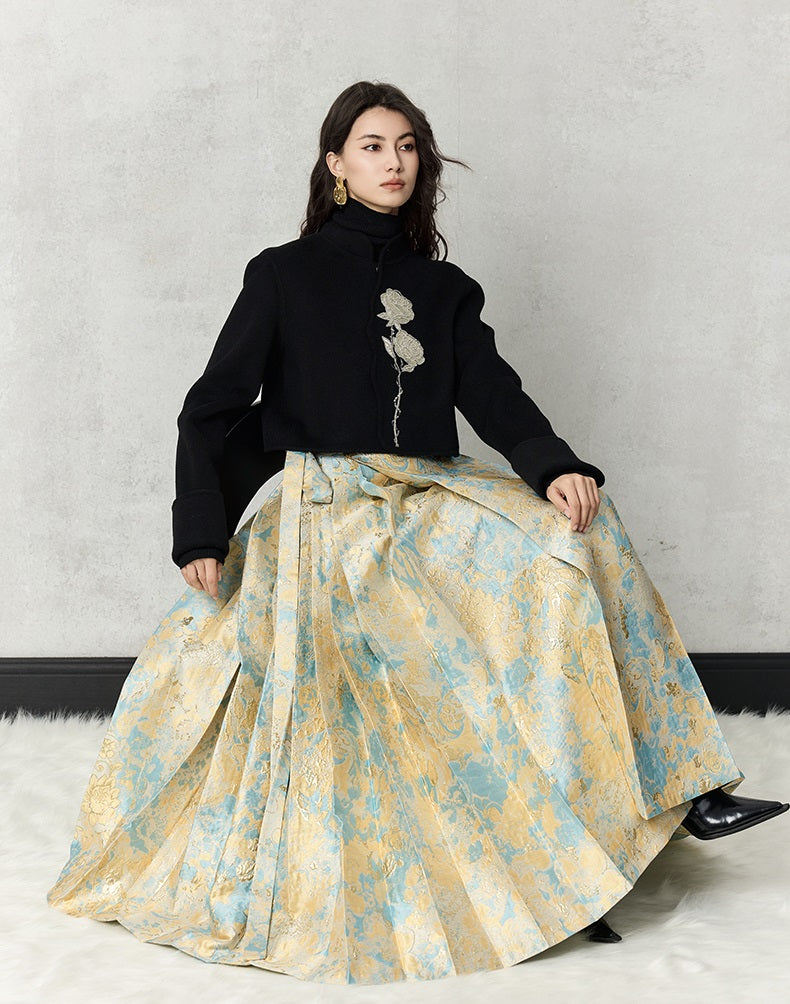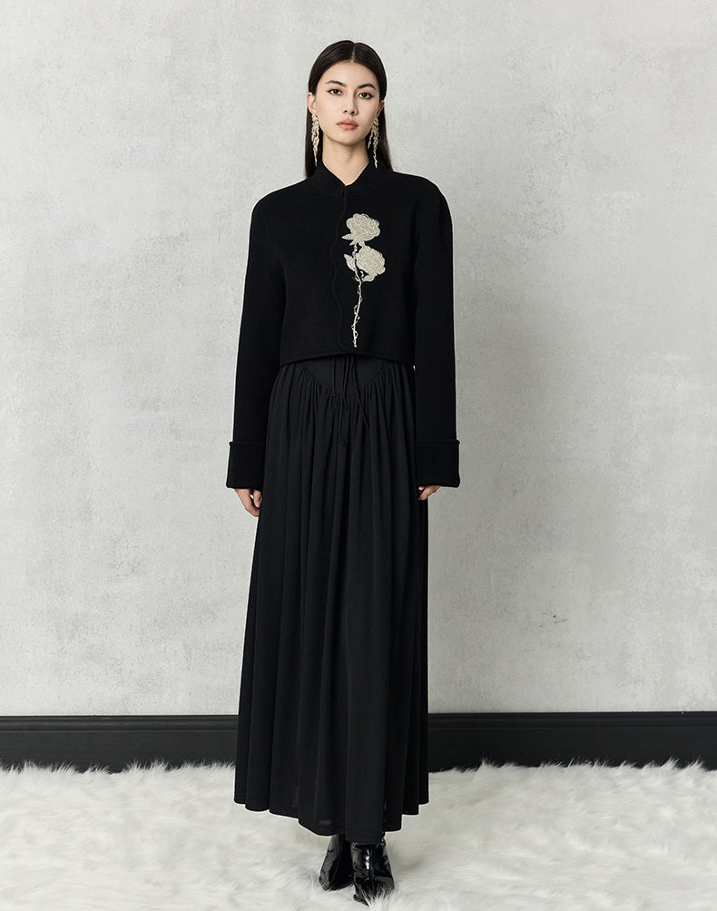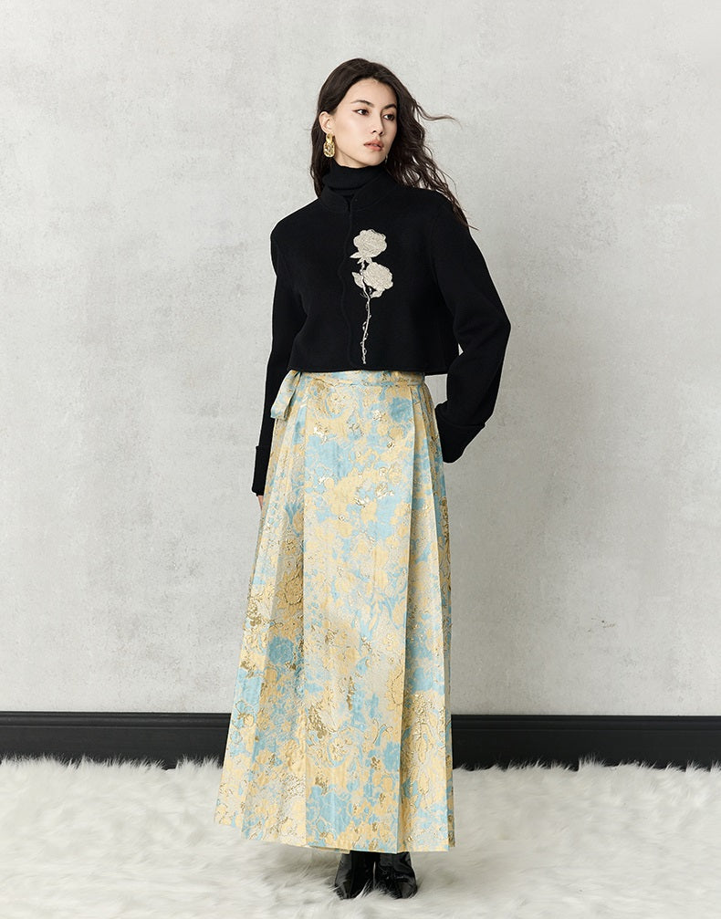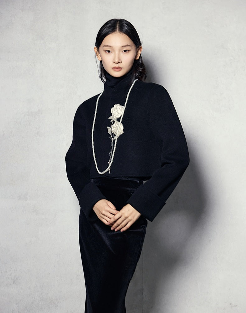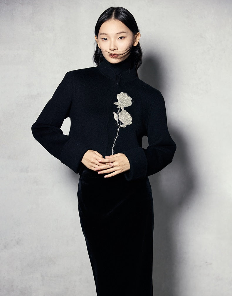 The HECO short double-sided tweed jacket is crafted from 100% wool, offering warmth and a luxurious texture. Designed with a loose fit, long sleeves, and a stand collar, it features elegant embroidery and a hidden button closure for a clean, sophisticated look. Available in red and black, this jacket combines classic tweed style with modern detailing for versatile wear.