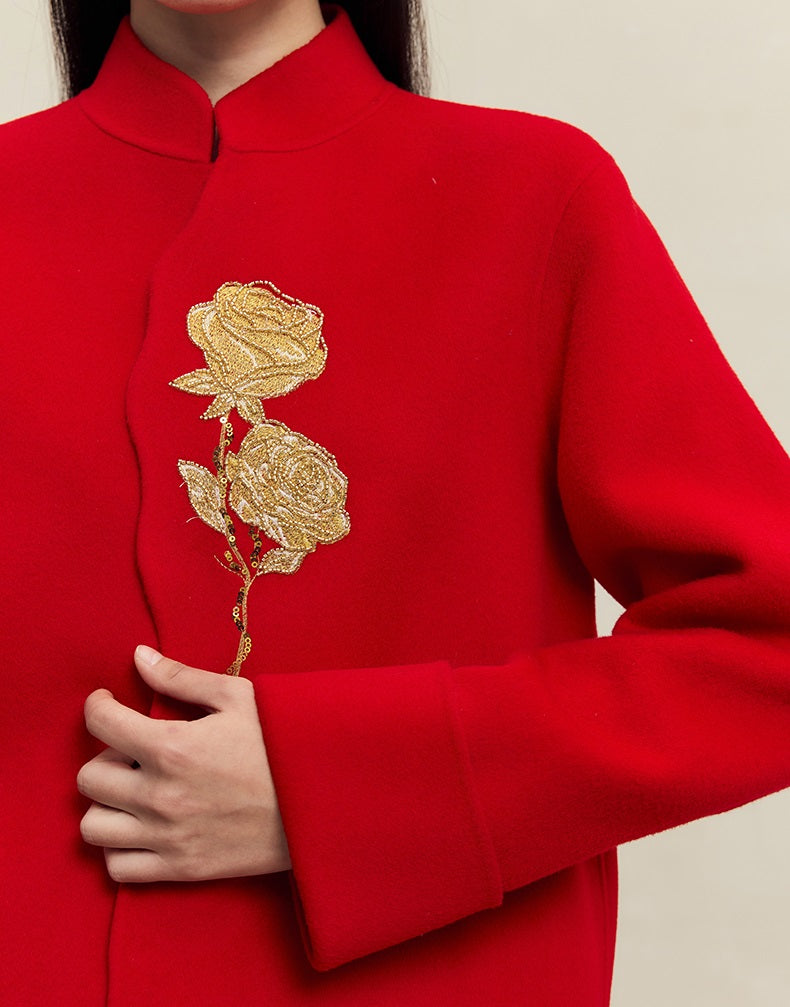 HECO 100% wool Embroidery Red black Short Double-Sided Tweed Jacket Women - out.