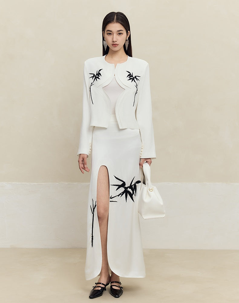 The HECO maxi skirt features a natural waist and a front slit, crafted from an 80% acetate and 20% polyester blend for an anti-wrinkle, smooth finish. Available in black and white, this long skirt combines elegance with practicality, offering a flattering silhouette and ease of movement.