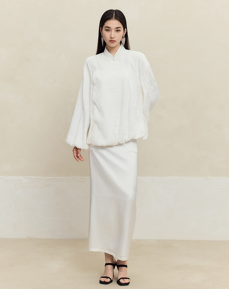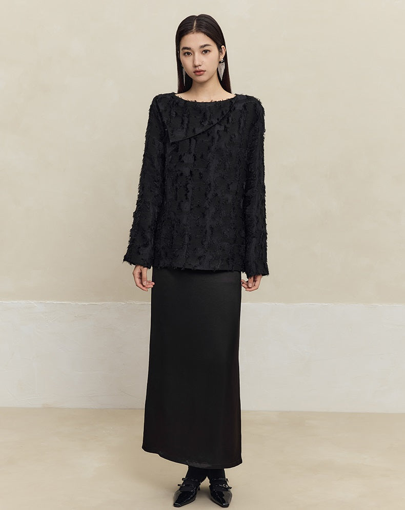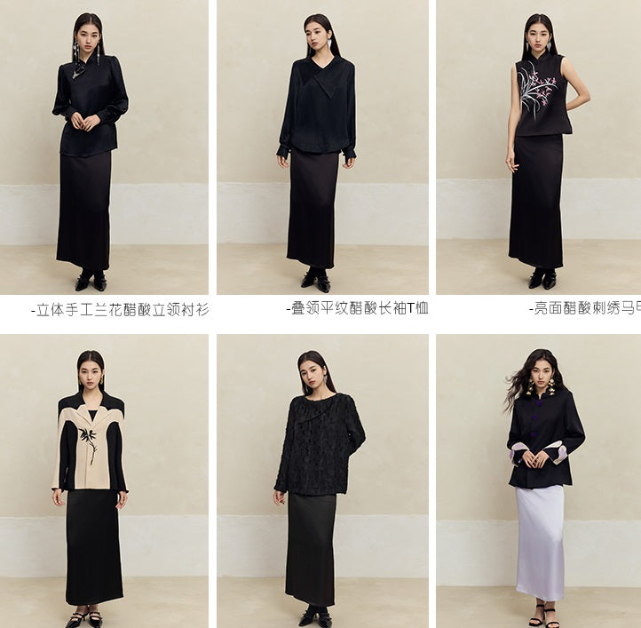 The HECO high-waisted long skirt blends 62% acetate fiber with 38% cuprammonia fiber, delivering a smooth, luxurious texture. Available in purple, black, and white, this skirt offers a flattering silhouette with elegant drape, ideal for sophisticated and versatile styling.
