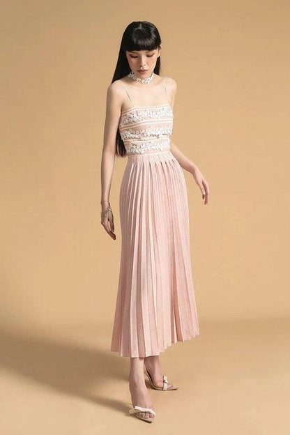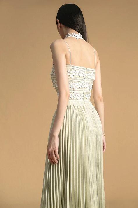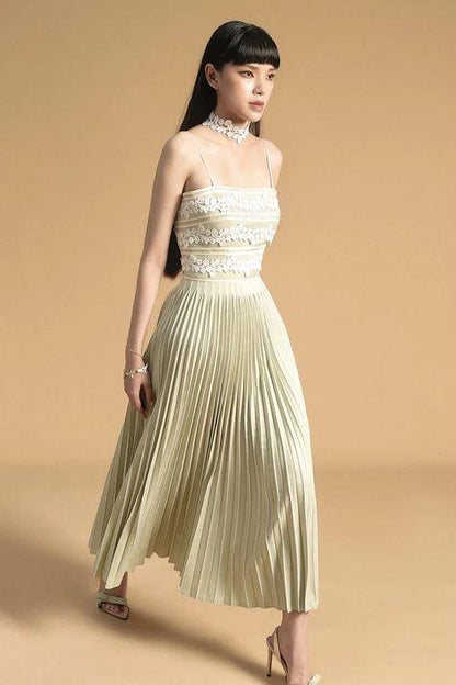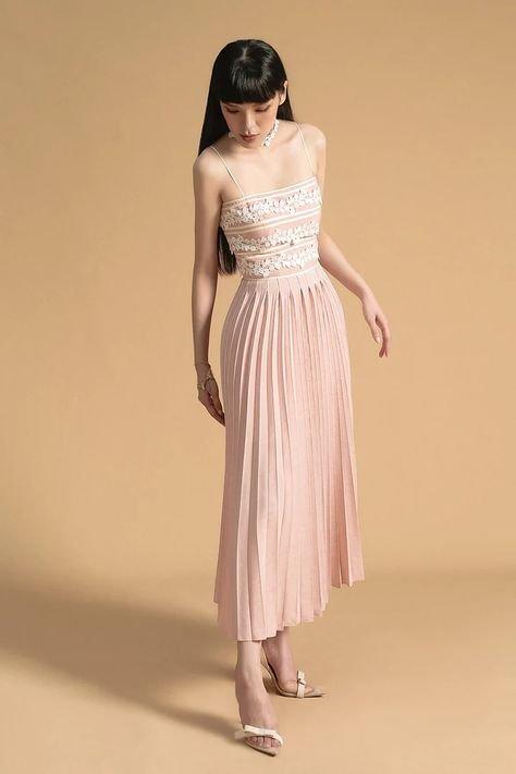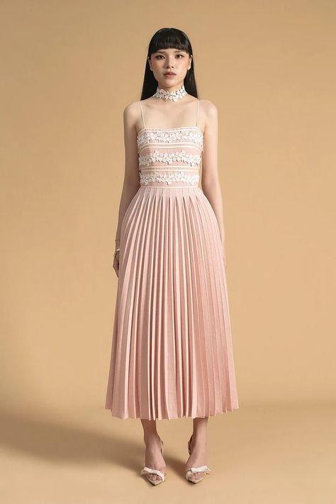 A charming dress with camisole design mixed with attached flower lines helps to elevate the softness and feminineness of the product. The pleated skirt also contributed to creating a flexible and versatile look of the dress