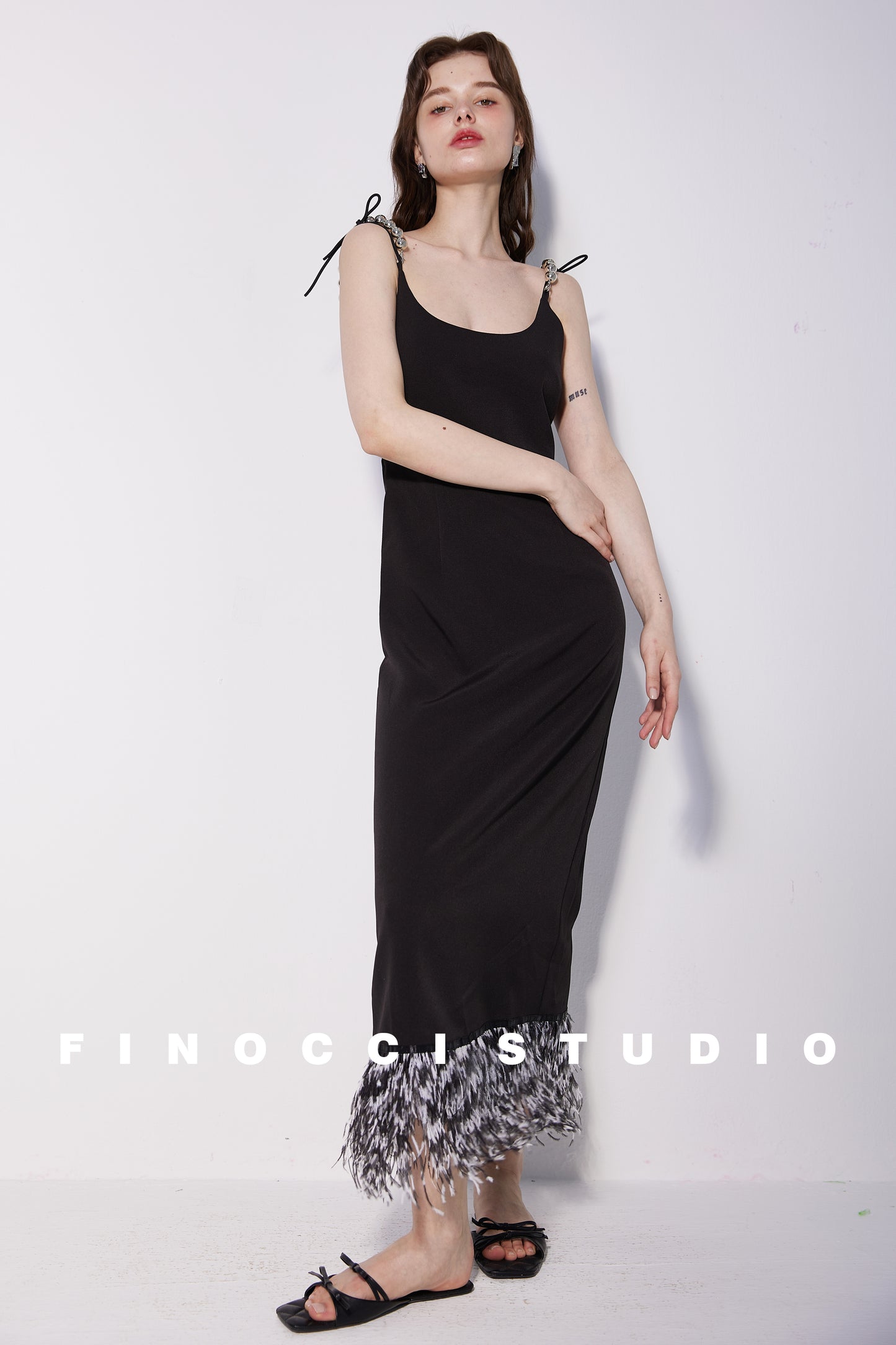 High-end luxury silver beaded satin dyed ostrich feather vintage backless black dress - Pavail