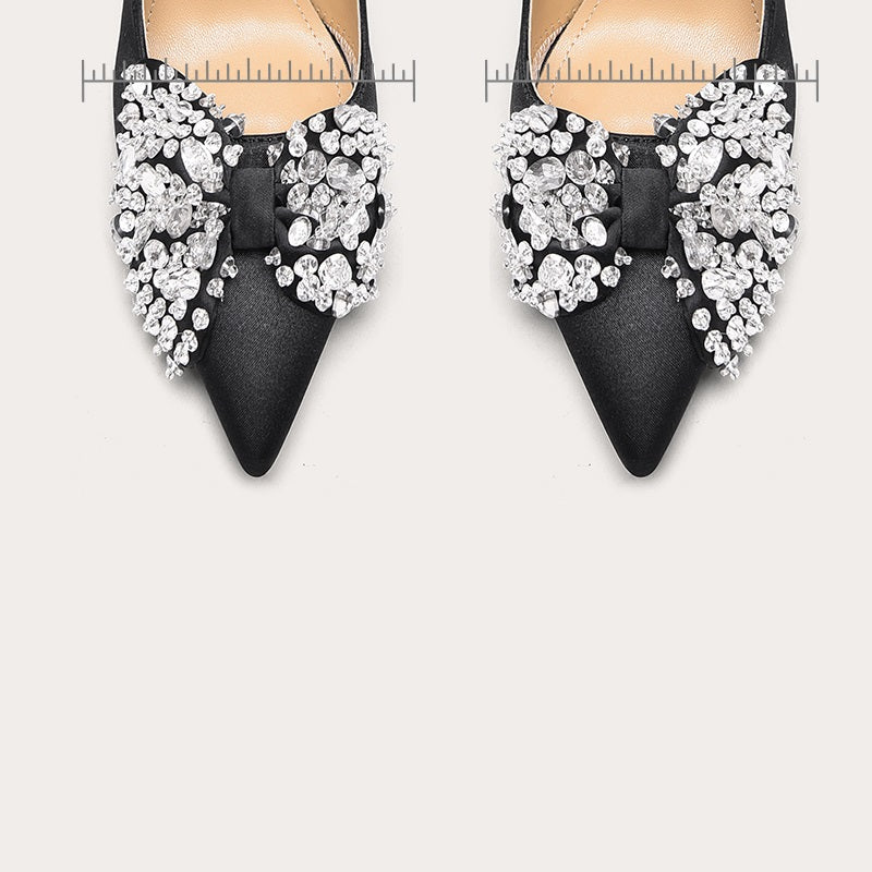 This elegant single shoe features a one-pedal closure, shallow mouth opening depth, and a fine-heeled style. It also boasts a plain pattern, bow rhinestone popular element, pointed toe style for formal wear, rubber sole, sheepskin insole and help surface materials. The shoe-making process is adhesive.