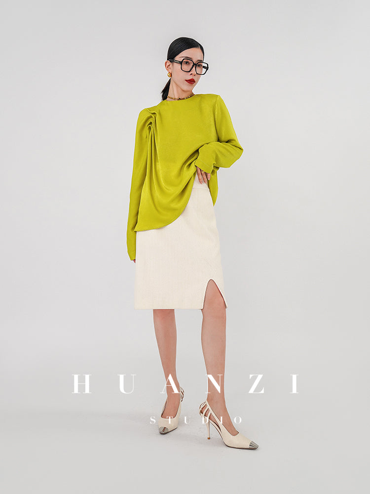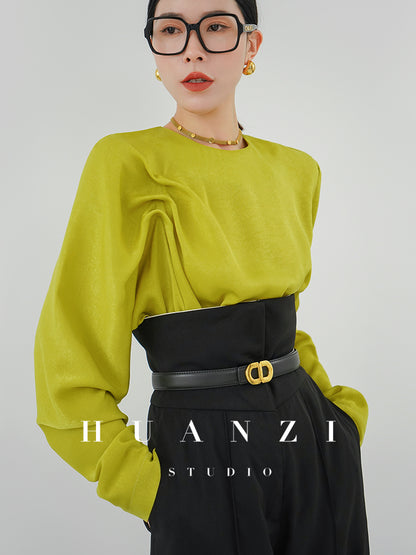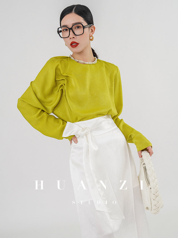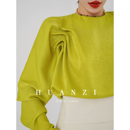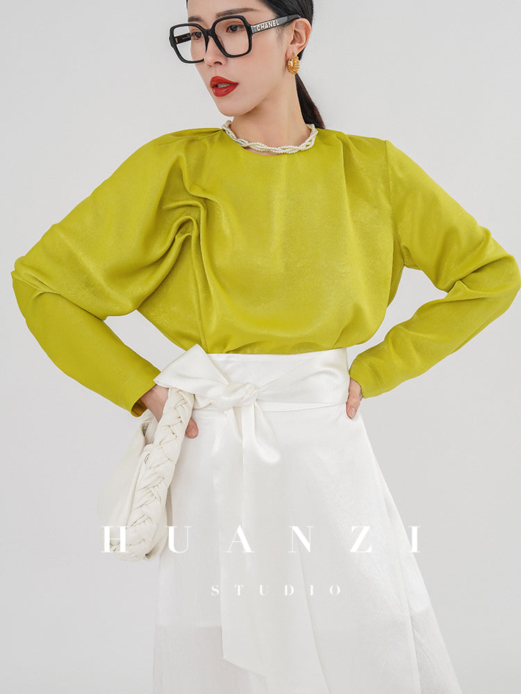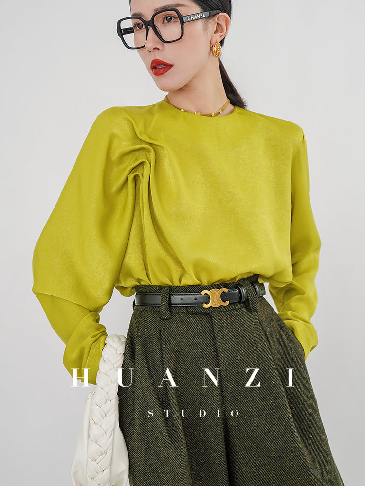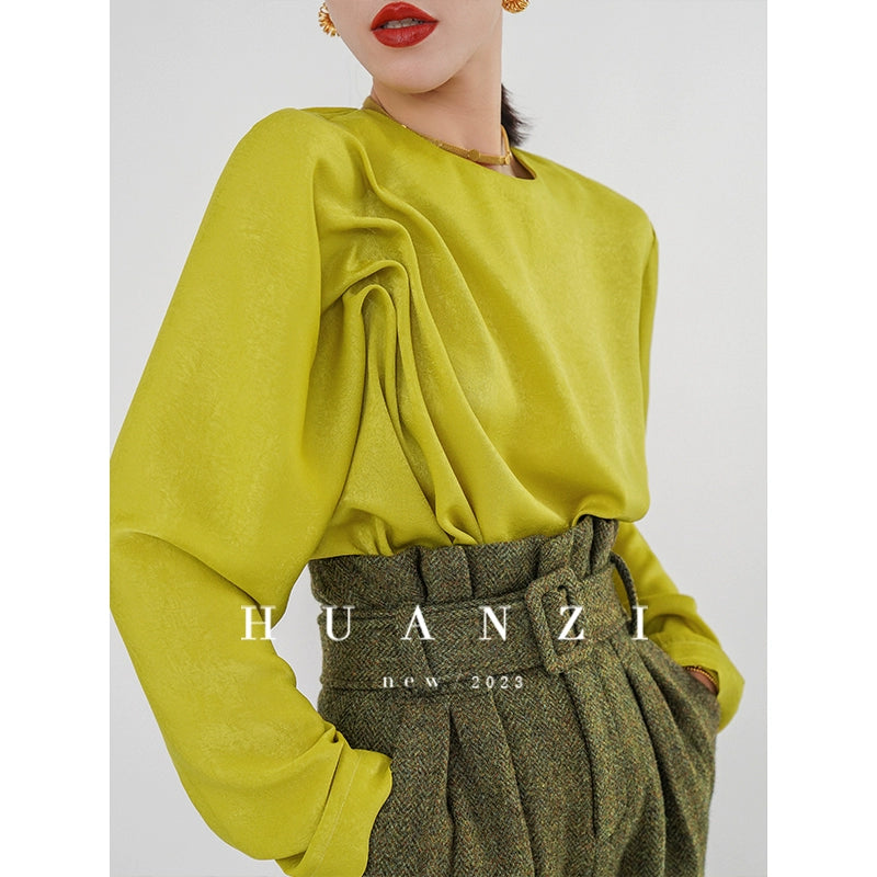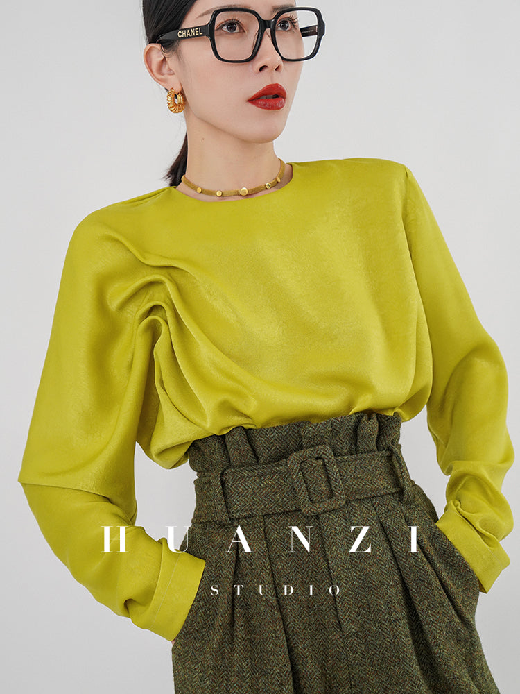Huanzi silky satin pleated women's spring autumn long-sleeved top blouse - Aniy