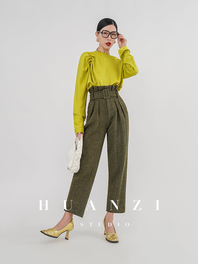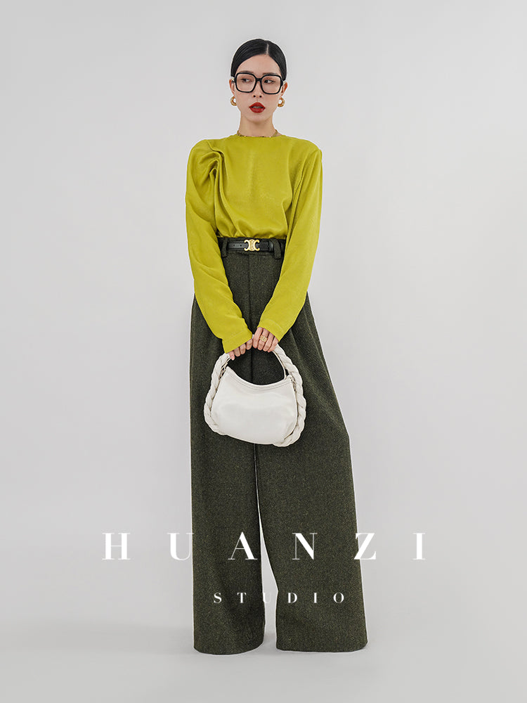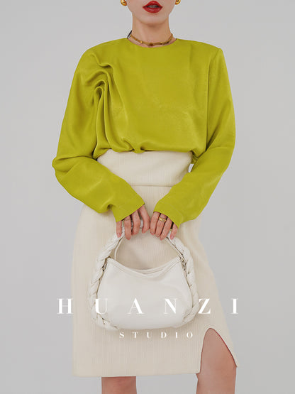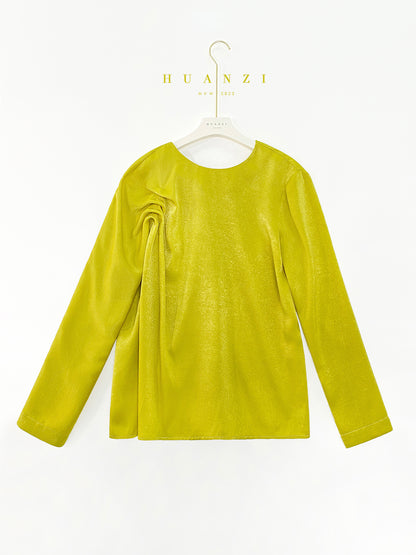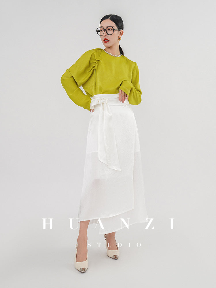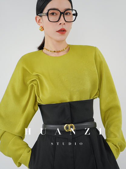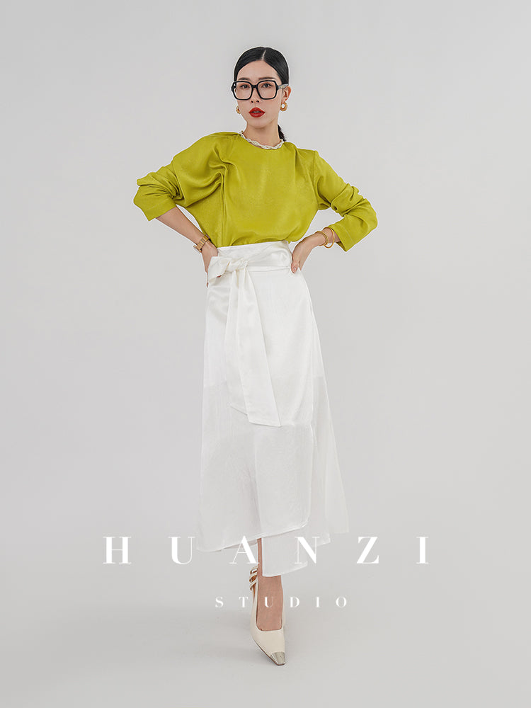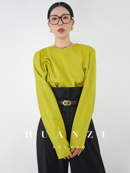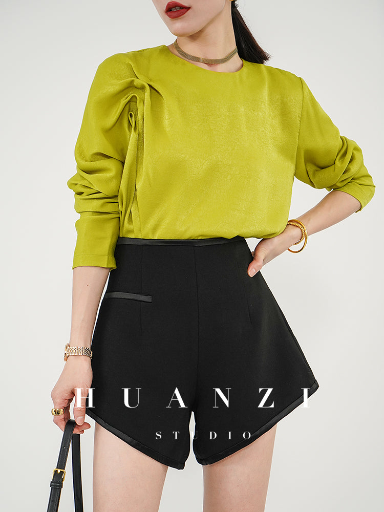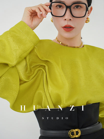 Huanzi silky satin pleated women's spring autumn long-sleeved top blouse - Aniy