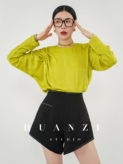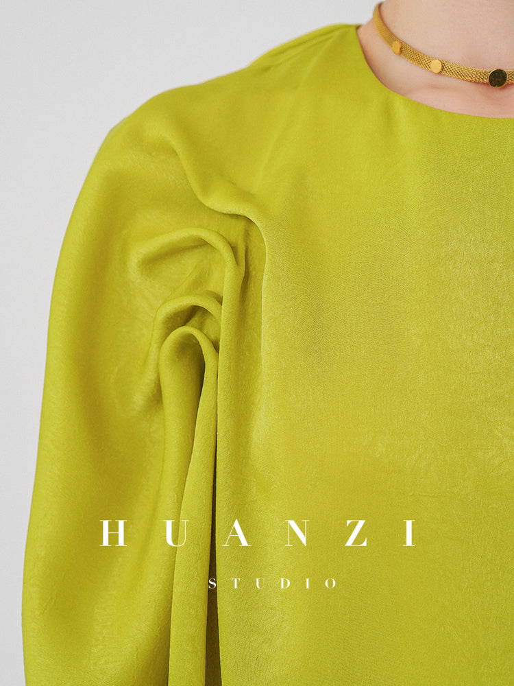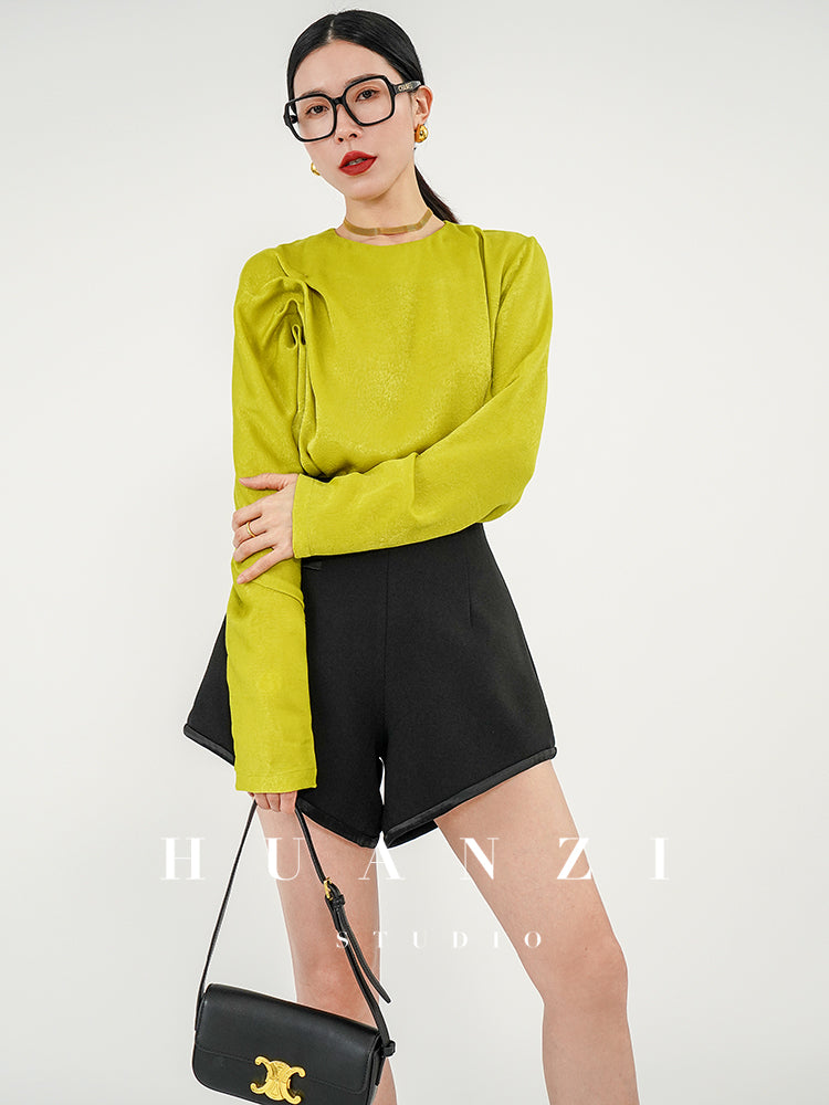 Crinkled Bright Satin Shirt. Comfortable touch, The appearance is bright and dazzling, showing a luxurious luster. Fabric drapes smoothly. Skin feels smooth and cool as ice silk Like the imprint of early summer, hiding in the flower room. Designed for a relaxed fit without feeling baggy. The crimped arc-shaped pleats enrich the visual level and have a sense of retro romance. The fabric feels soft and comfortable, and the unique texture breaks the formality of conventional shirts. A desaturated soft yellow hue with a hint of sunshine
