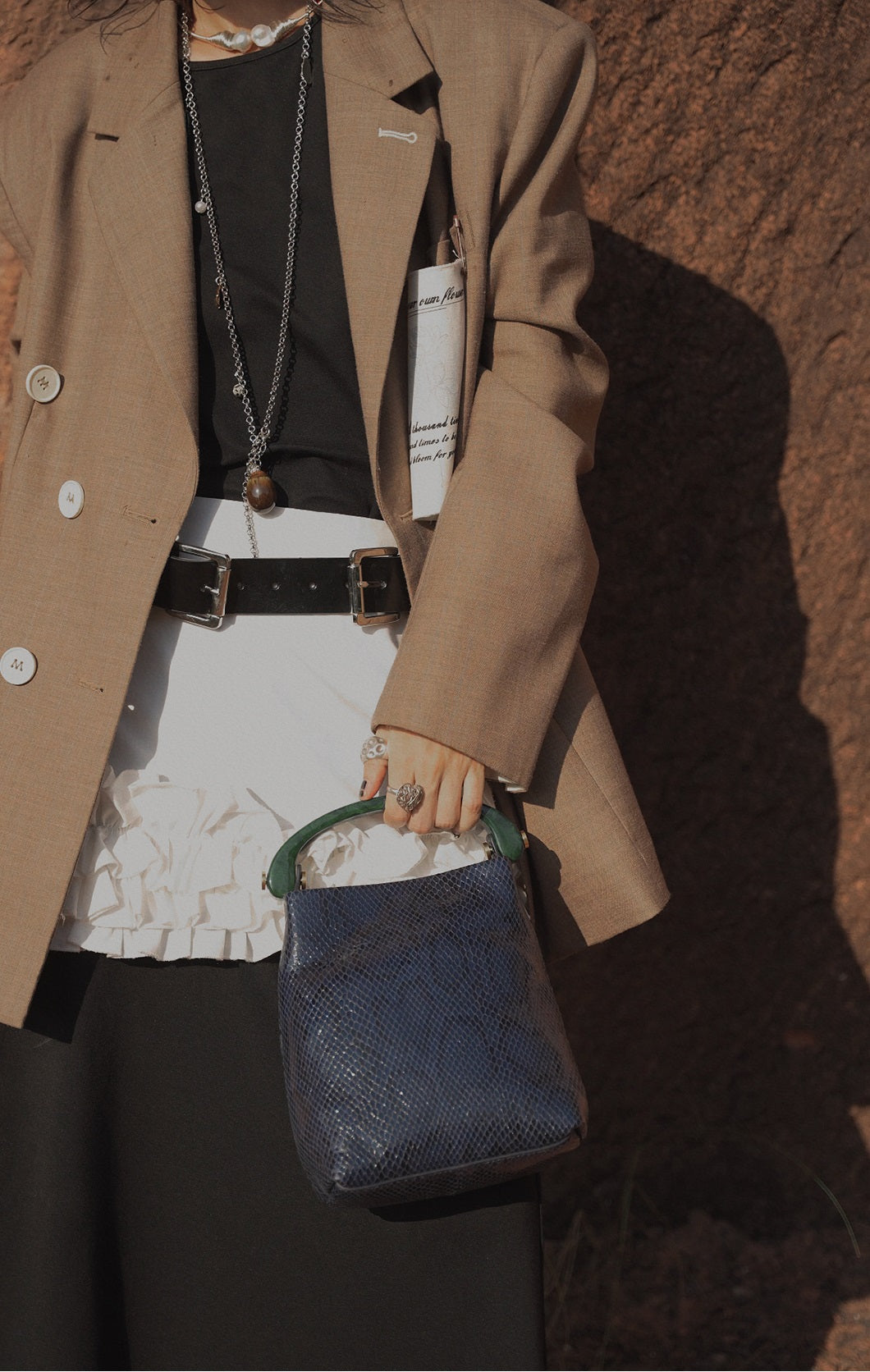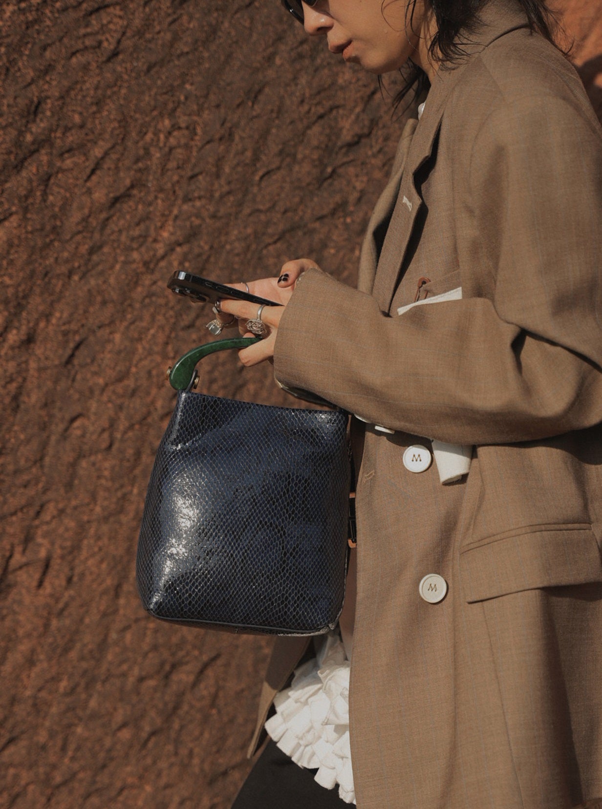 The IUBALLET KIA handbag features luxurious top-grain leather crafted with a sophisticated snake print design. Its interior offers a main compartment, a slip pocket, and a secure zippered inner pocket to keep essentials organized. A magnetic clasp closure ensures easy access while maintaining a sleek silhouette, making this bag a refined accessory that combines timeless style with practical functionality.