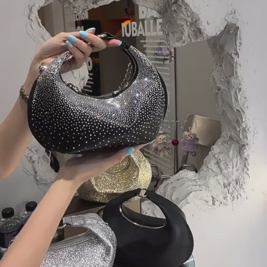 The IUBALLET Piercing Bag New Diamond Encrusted Handbag - EIGHT offers a sophisticated blend of luxury materials and practical design. Crafted in silk and top-grain leather with crystal accents for the black crystal edition, it features a non-adjustable chain strap, while other color options come with adjustable leather straps. Inside, the bag includes a main compartment, a slip pocket, and a zippered inner pocket, secured by a zipper closure for added safety. This handbag combines elegance with functionality, ideal for those seeking refined style and organized storage.