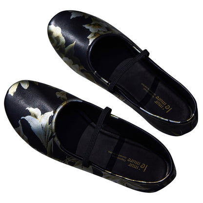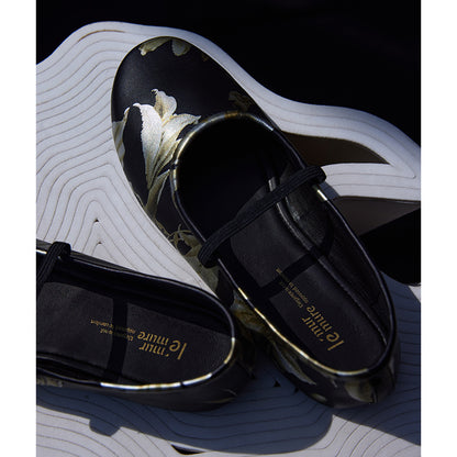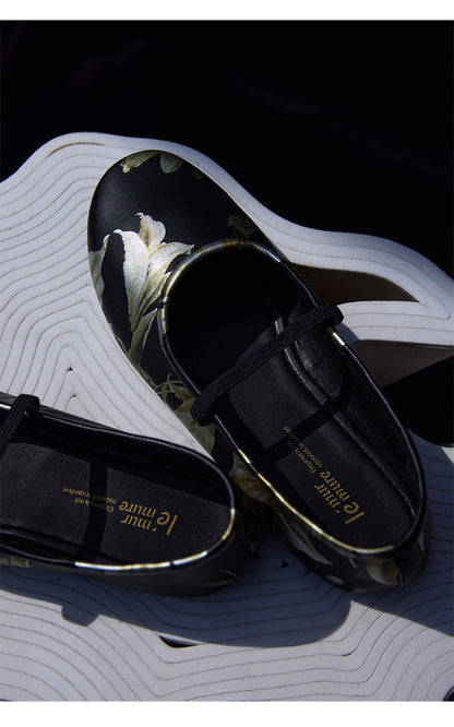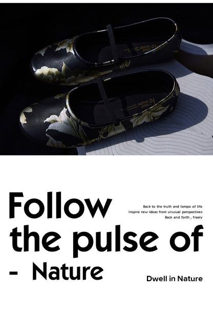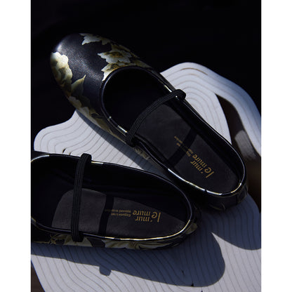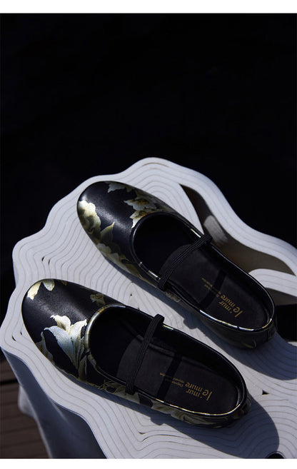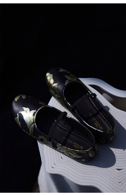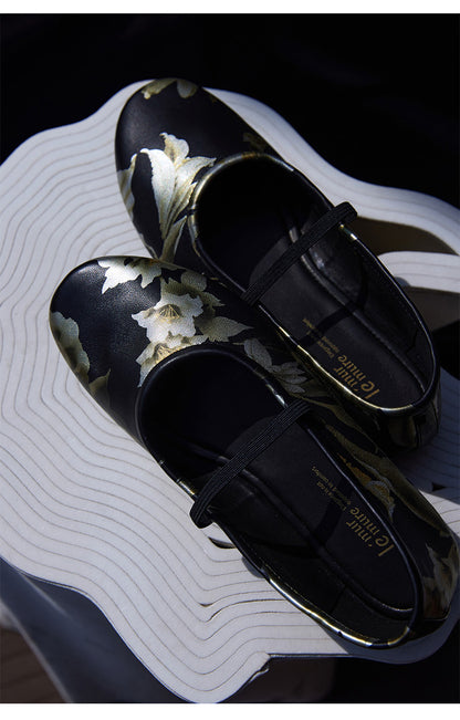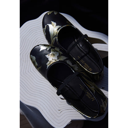 The Murmure 2023 spring new national style Mary Jane women's shoes retro oil painting small leather shoes casual shoes features a one pedal closure and a plant flower pattern on a retro style with popular elements including flowers. The flat heel (≤1cm) provides comfort and the black pottery gold color and round toe give the shoes a leisurely, fashion forward look. The shoes feature a shallow mouth opening, a shaved leather upper, sheepskin insole and a sheep fur help surface.