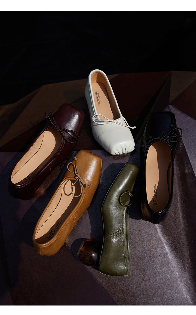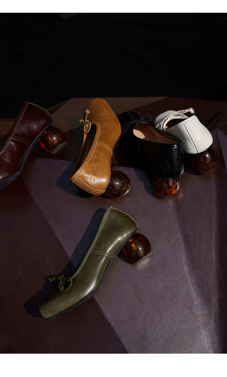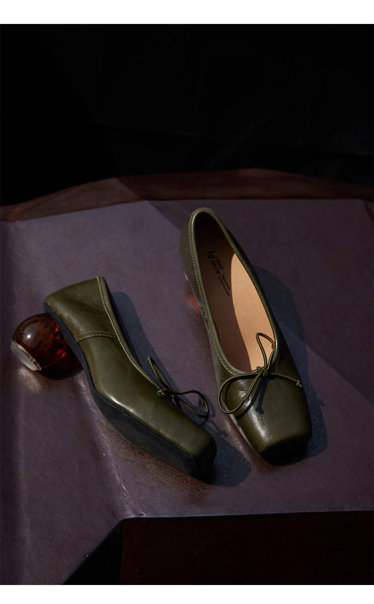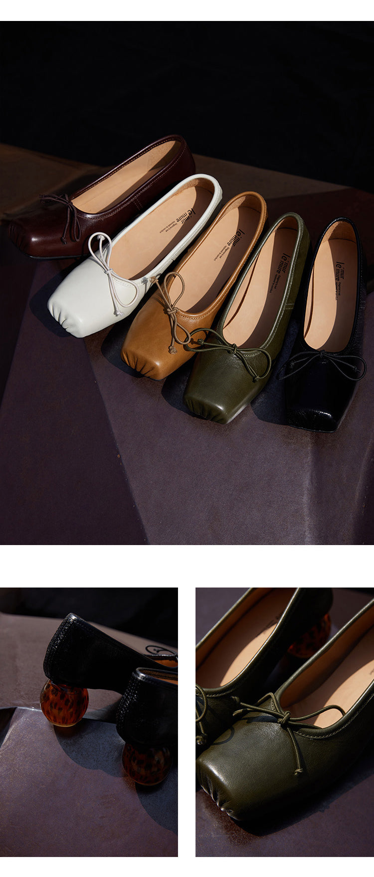 The closure method is one pedal, and the style of the heel is a special-shaped variant, while the toe style is square headed. It features a bow as a popular element and the heel height is between 3-5 cm. The color range includes pebble warm white, white olive branch green, olive branch black mulberry and black. The upper is crafted of top layer cowhide and the insole is made of first layer cowhide. The inner material is also top layer cowhide and the opening depth is shallow. This single shoe is finished with a water-dyed cortex.