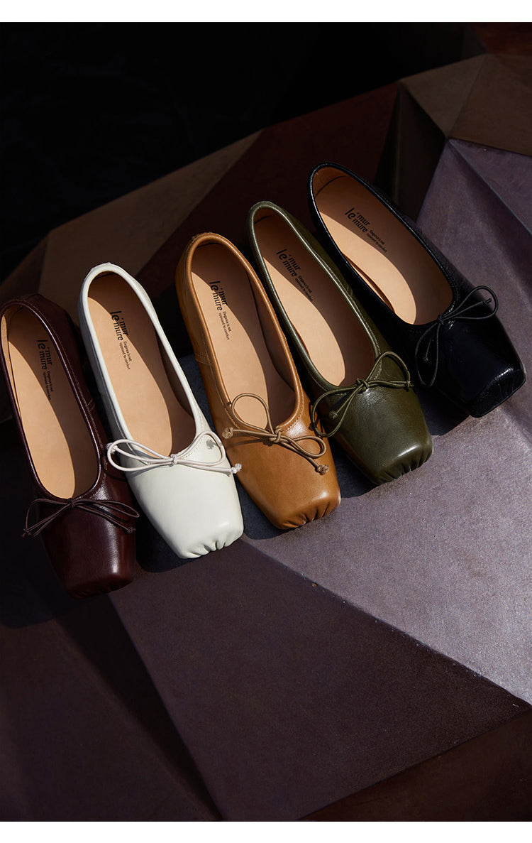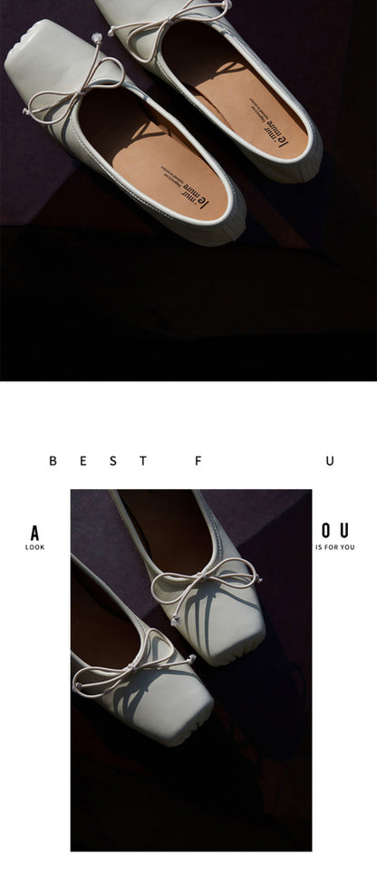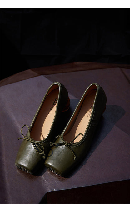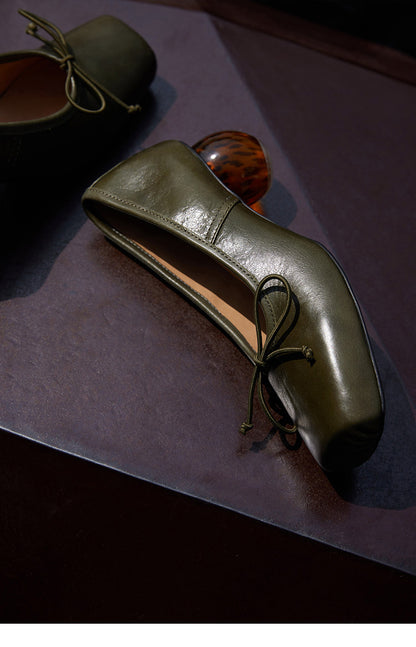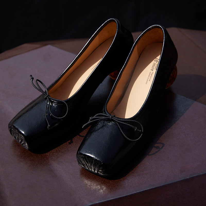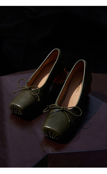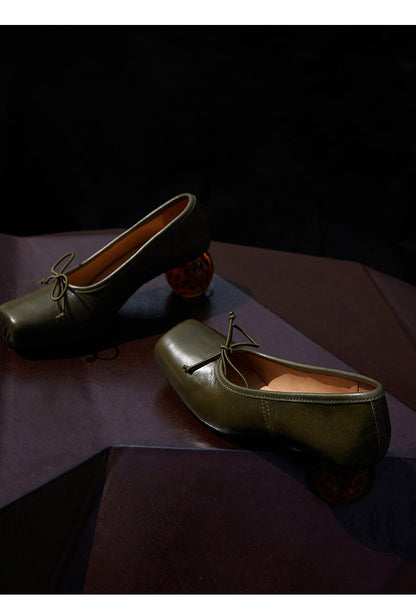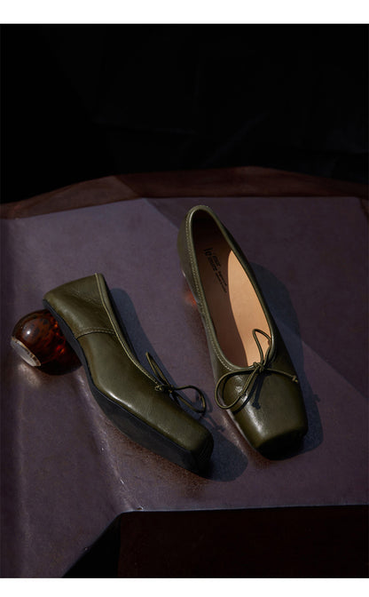 The closure method is one pedal, and the style of the heel is a special-shaped variant, while the toe style is square headed. It features a bow as a popular element and the heel height is between 3-5 cm. The color range includes pebble warm white, white olive branch green, olive branch black mulberry and black. The upper is crafted of top layer cowhide and the insole is made of first layer cowhide. The inner material is also top layer cowhide and the opening depth is shallow. This single shoe is finished with a water-dyed cortex.