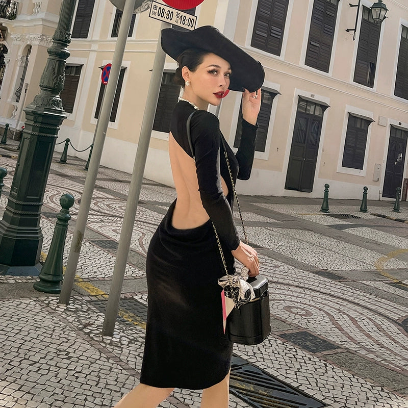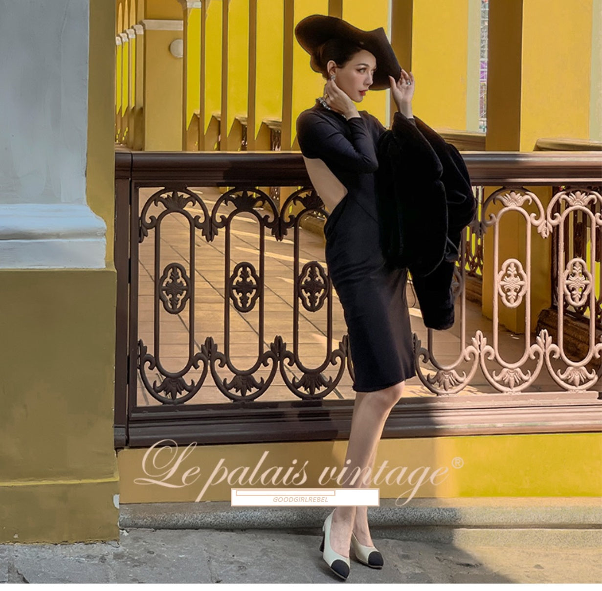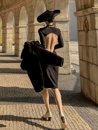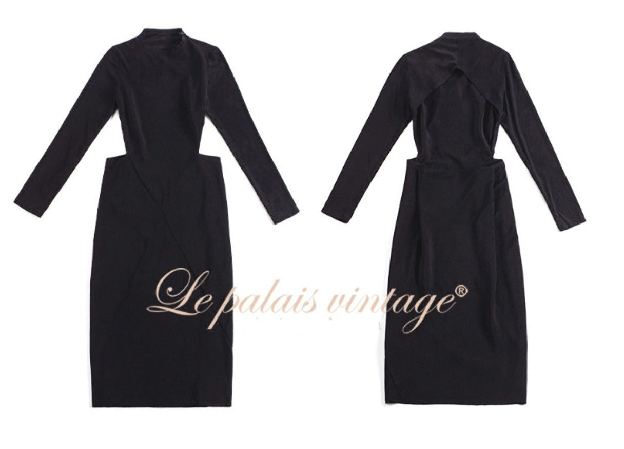 Transform your style with Le Palais Vintage's Black Long Sleeve Open Back Matte Satin Cocktail Dress. Its unique design features a long black gown with a dashing open back, perfect for fall or autumn events. This dress exudes luxury and sophistication, making you look glamorous and chic. Elevate your wardrobe with this fabulous and exquisite piece.
