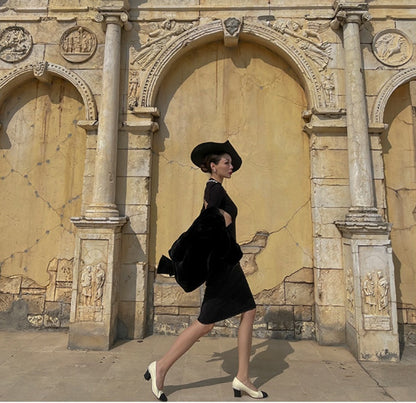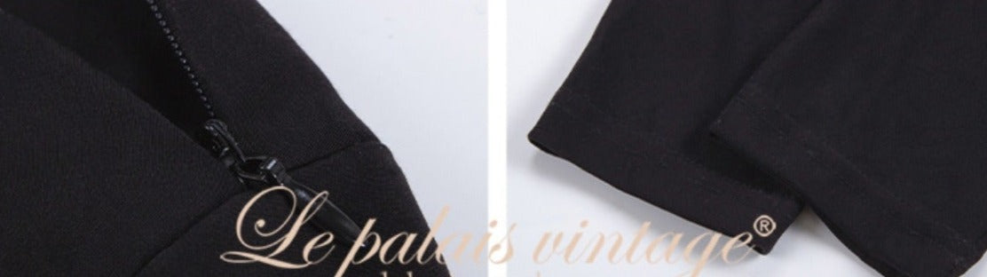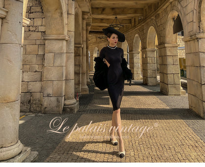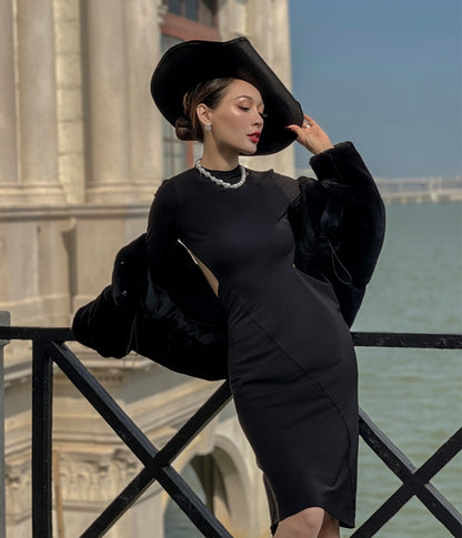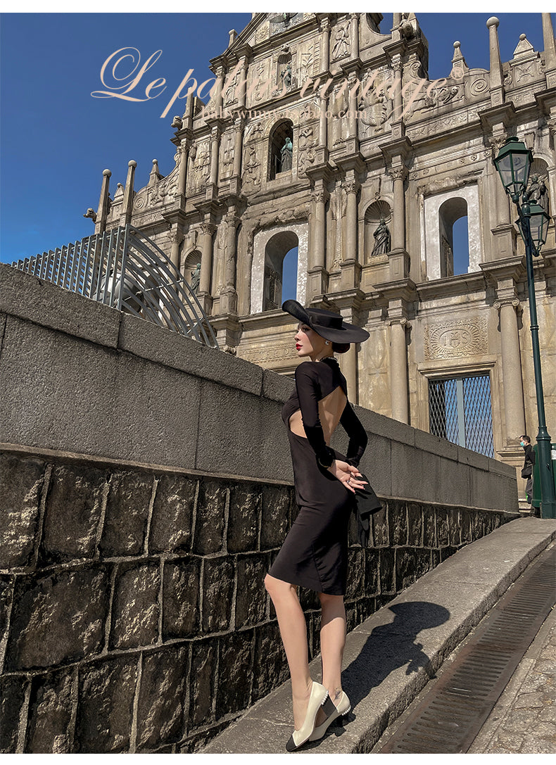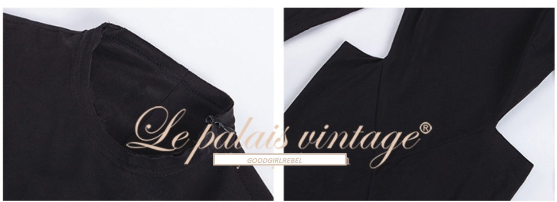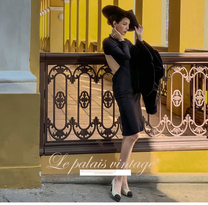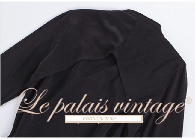 Le Palais Vintage Black Long Sleeve Open Back Matte Satin Cocktail Dress-Jade