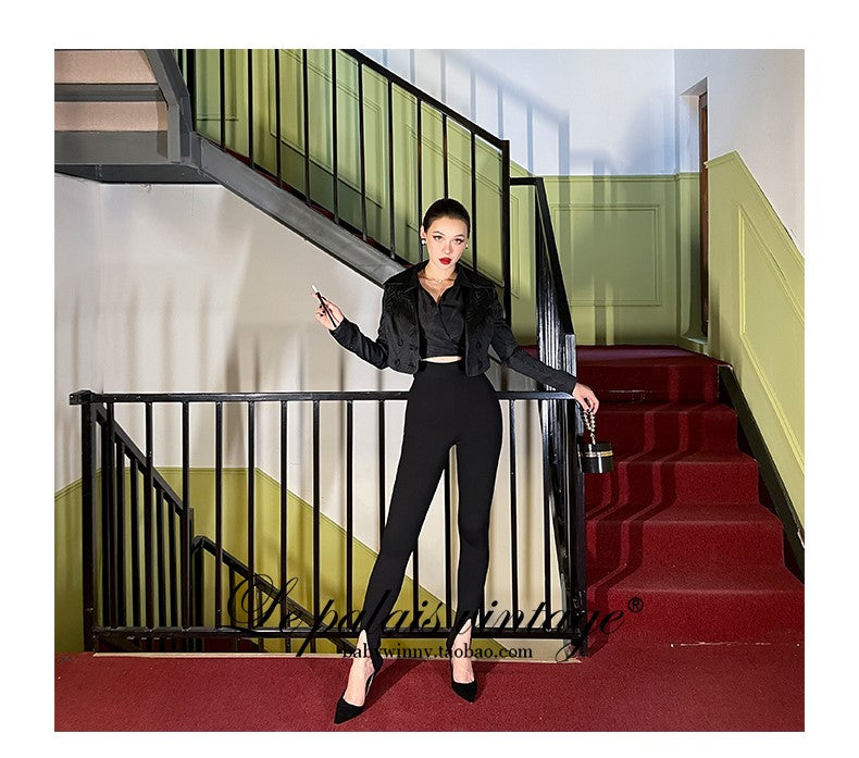 The Le Palais Vintage Black Long Sleeve Slim Fit Crop Dinner Jacket- Laurel exudes class and sophistication, perfect for the boss-chic woman. Its slim fit and cropped design creates a sleek and refined look, perfect for any upscale event.