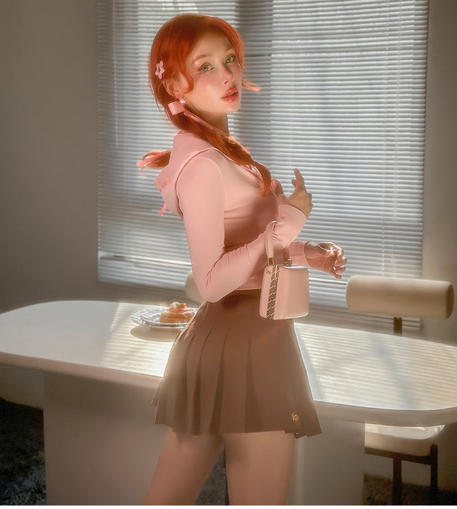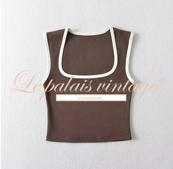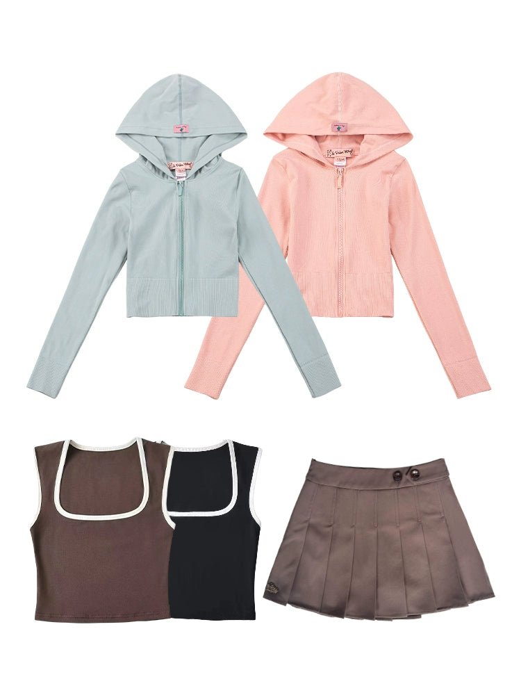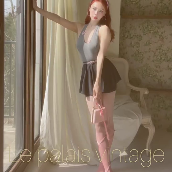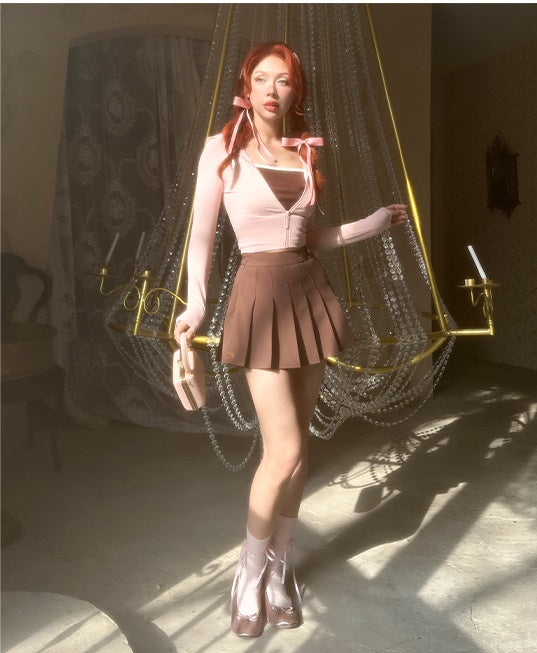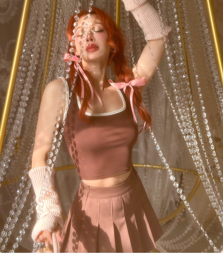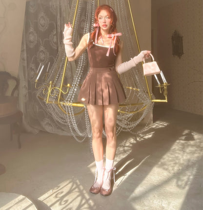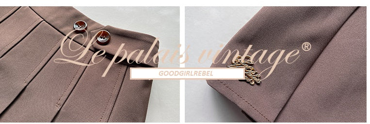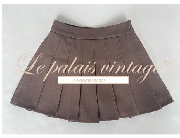 Le Palais Vintage Black Tank Top Pink and Blue Jacket Brown Pleated Skirt-Pinky.