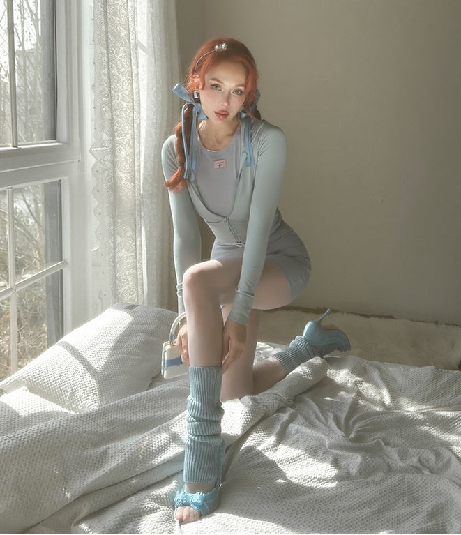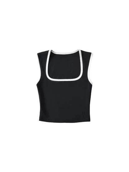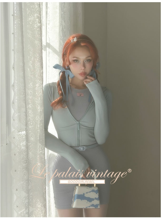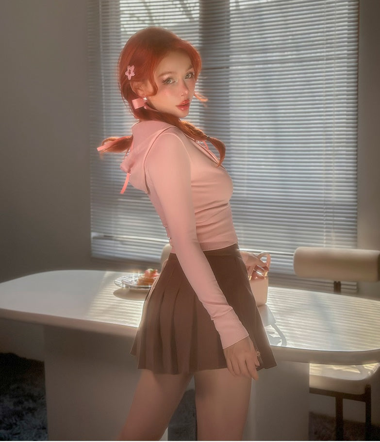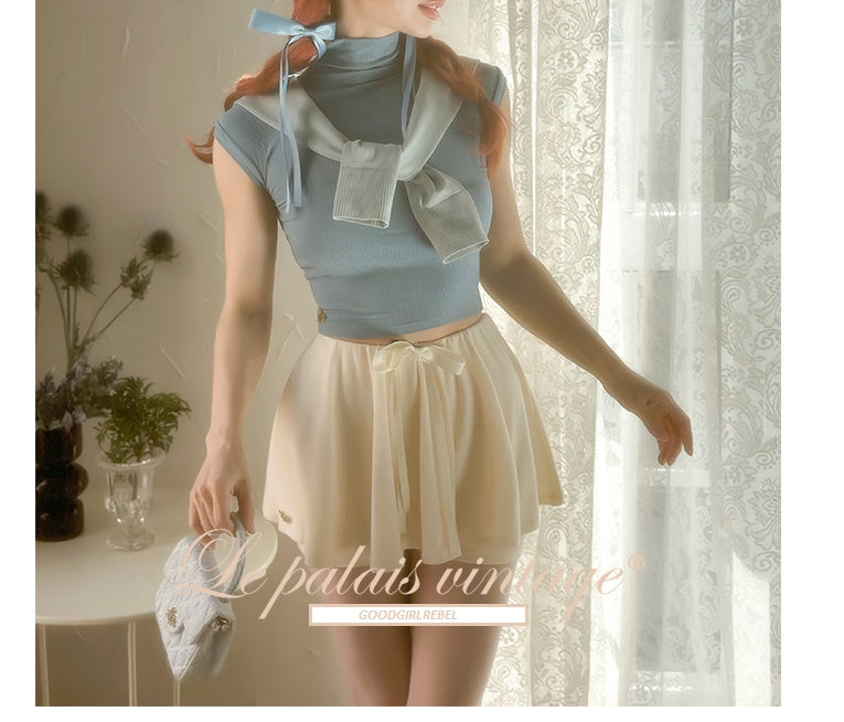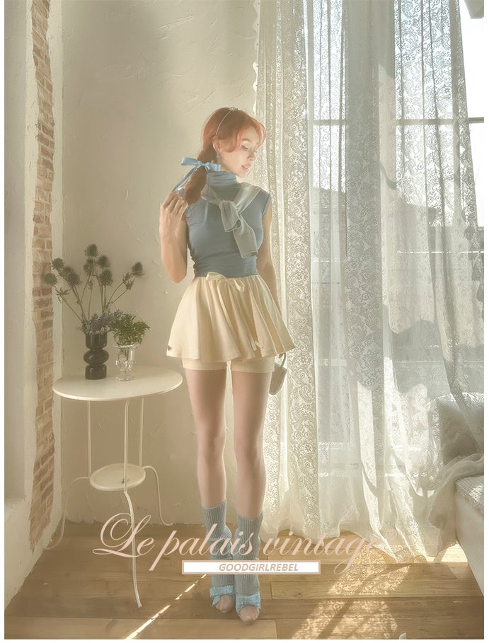 Le Palais Vintage Black Tank Top Pink and Blue Jacket Brown Pleated Skirt-Pinky.