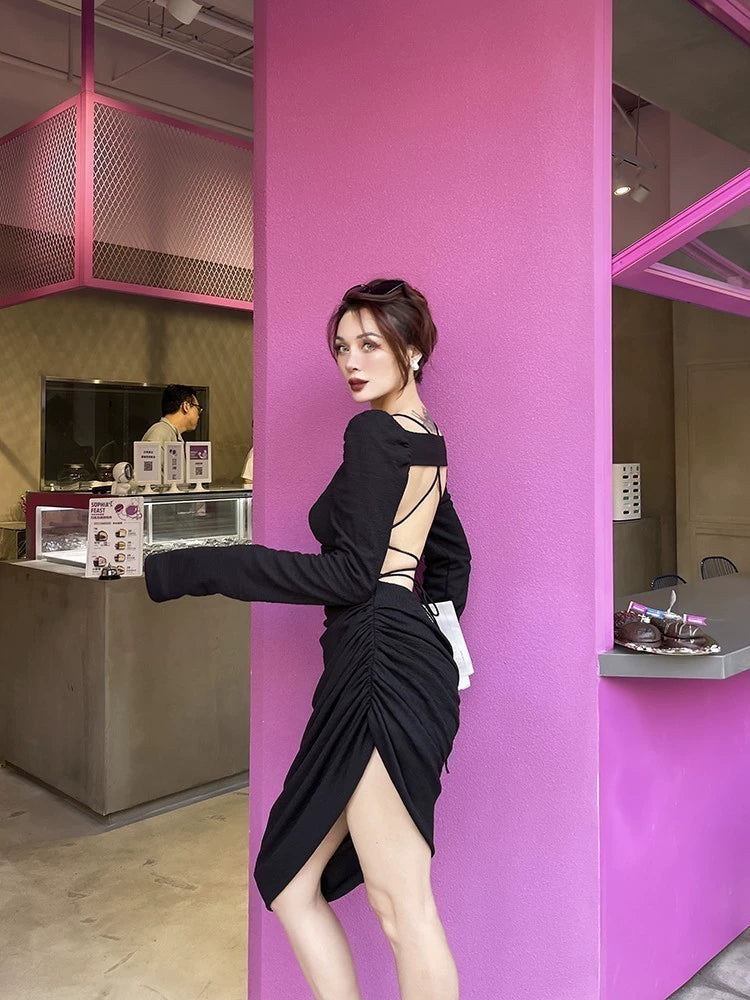 Le Palais Vintage Elegant Black Knit Open Back Pleated High Slit Sexy Dress-Plum