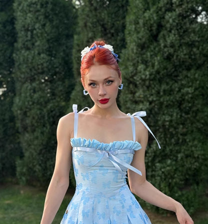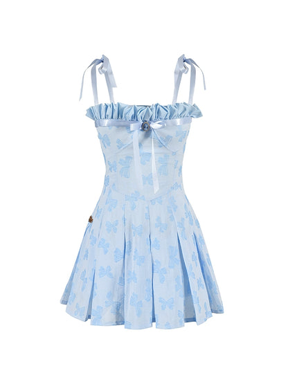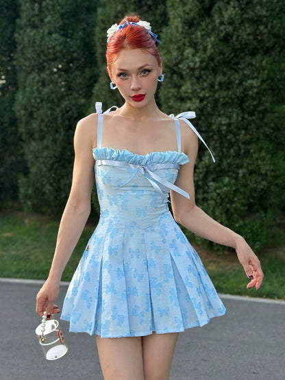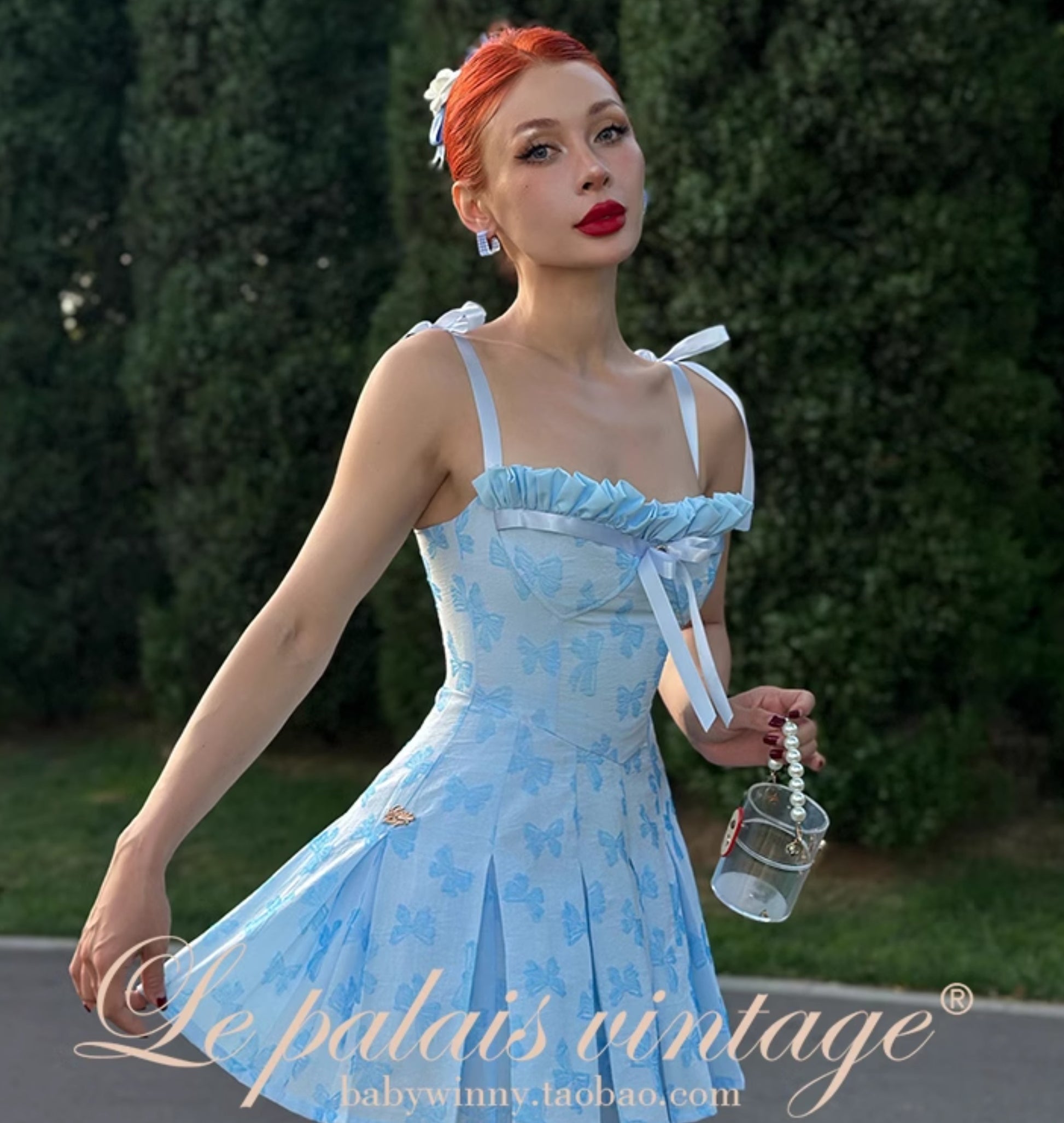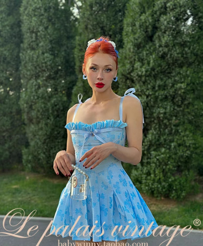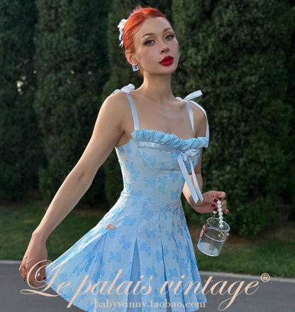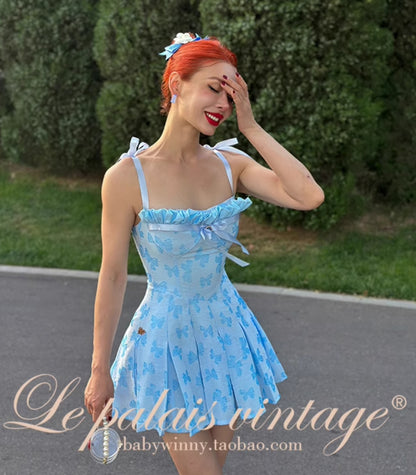 Le Palais Vintage Elegant Blue Sleeveless Short Pleated cottage core Dress- drey.