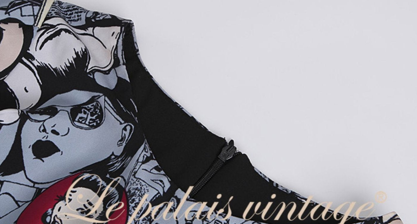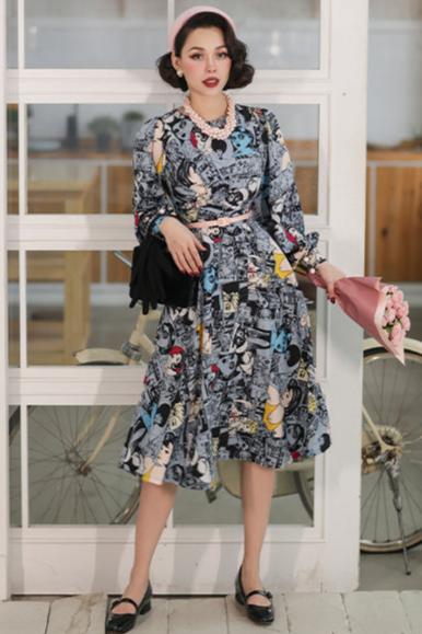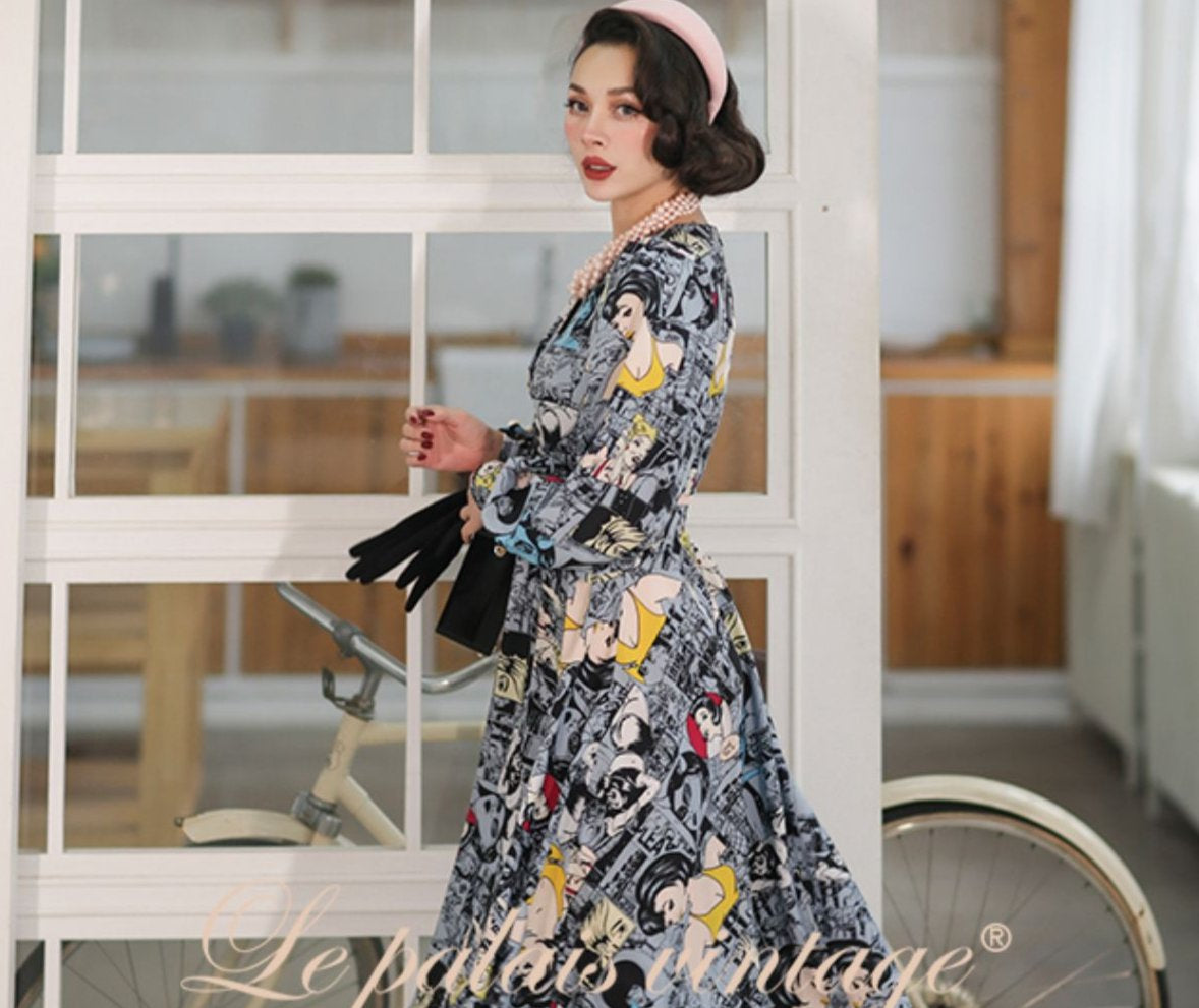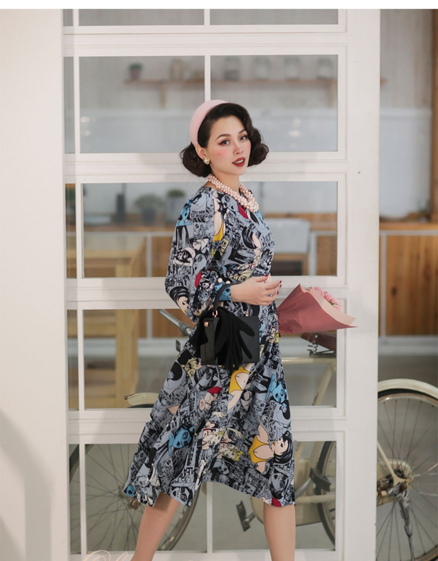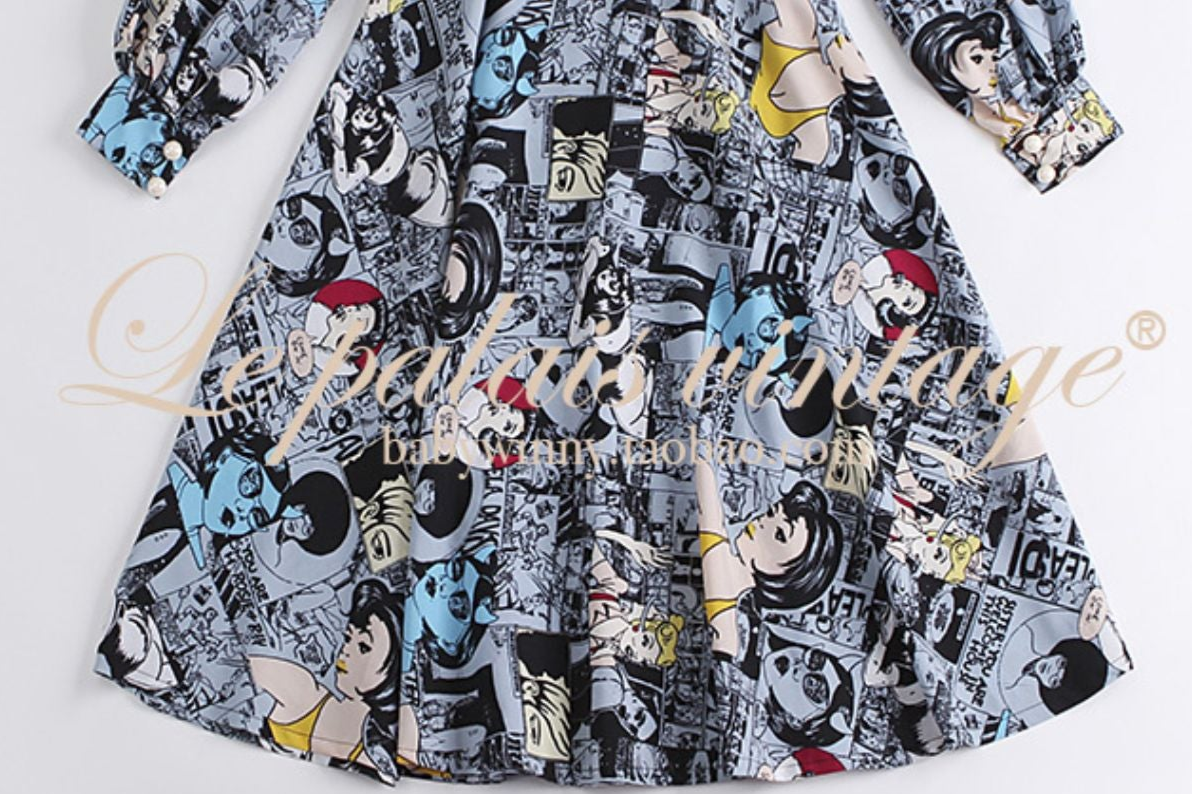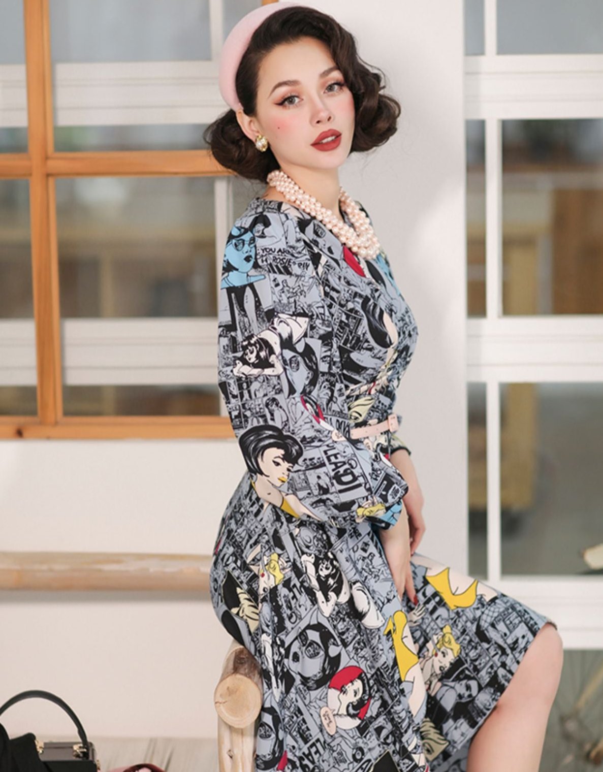 Le Palais Vintage Elegant Comics Design lantern Sleeve Dinner dress-Martha.