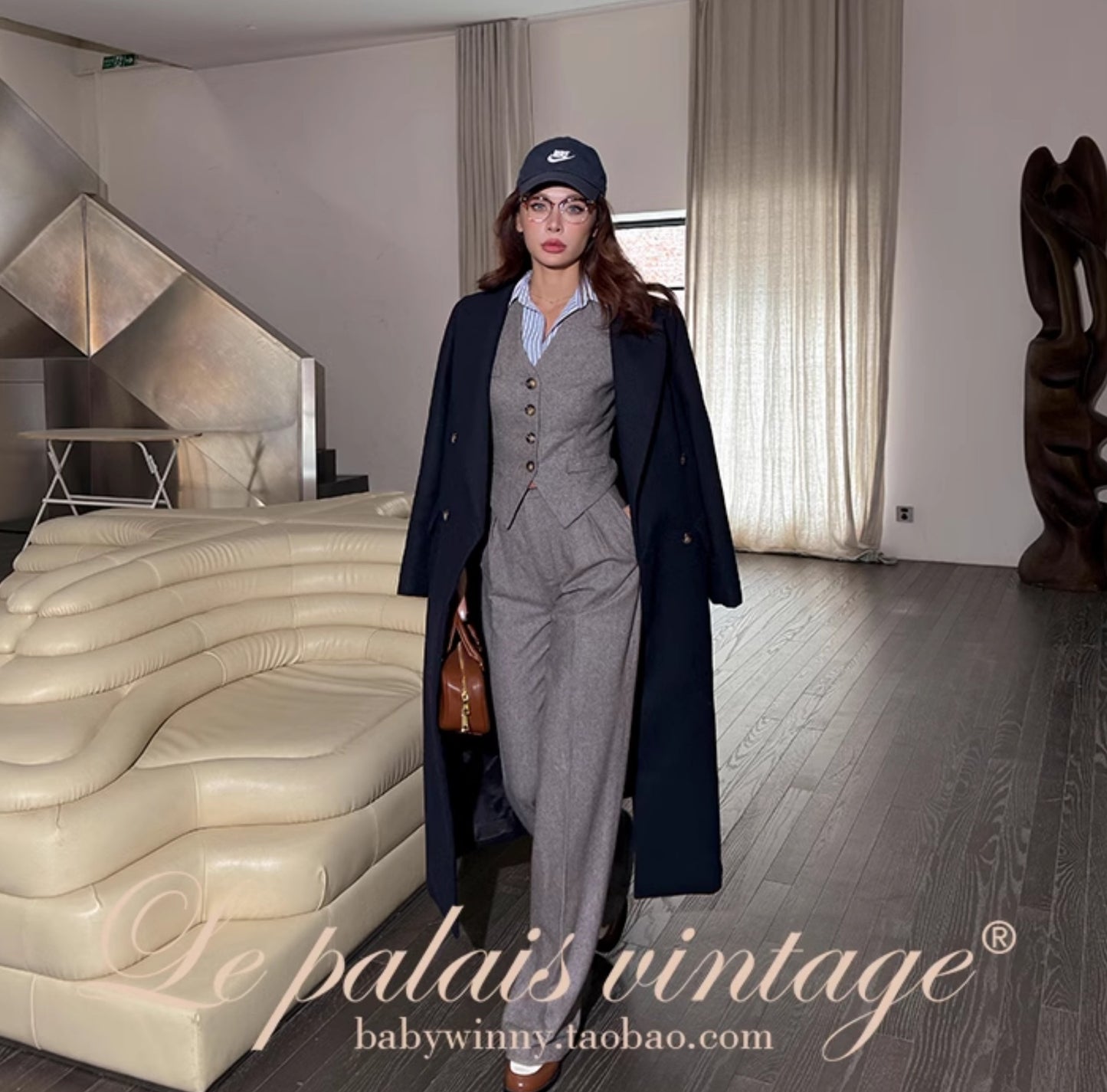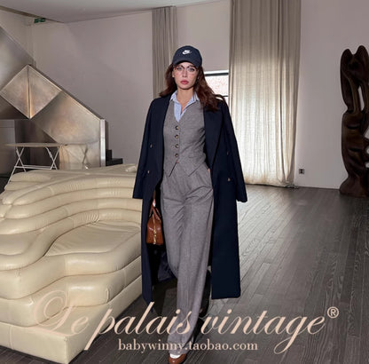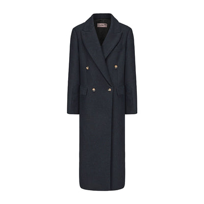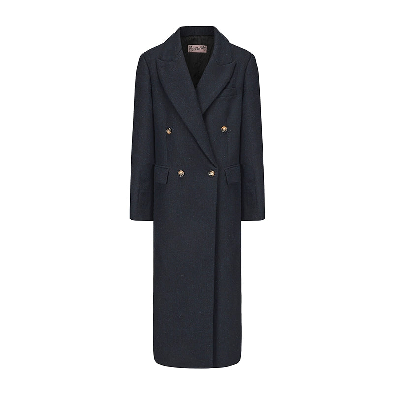 Le Palais Vintage Elegant Navy Blue Drape Suit Collar Long Sleeve Long Coat-KIATE.