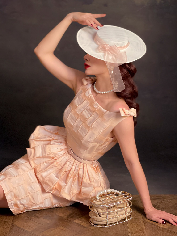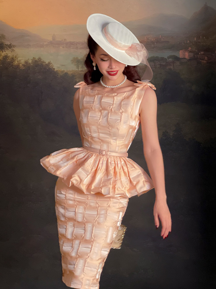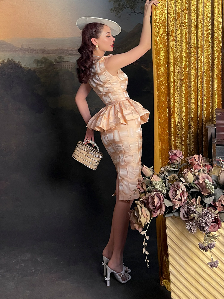 Le Palais Vintage Elegant Retro Plaid Sleeveless Peplum Banquet Dress-Bene