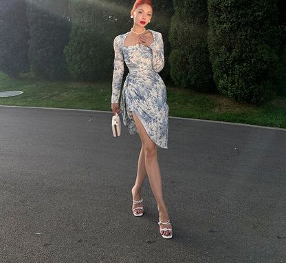 Le Palais Vintage Blue Long Sleeve Asymmetrical Pleated Midi Dress-ALIA.